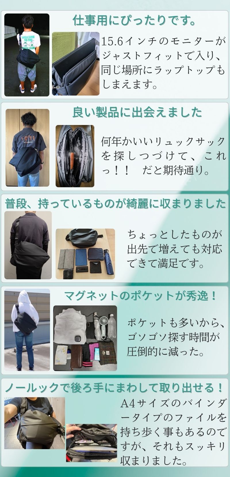 自転車通勤の方、リモートワークでPCをカフェやワーキングスペースに持ち歩くようなワークスタイルの方におすすめです。サイクリング、ツーリングが趣味の方には上着やレインコート、ドリンクを入れてのご使用がおすすめです。