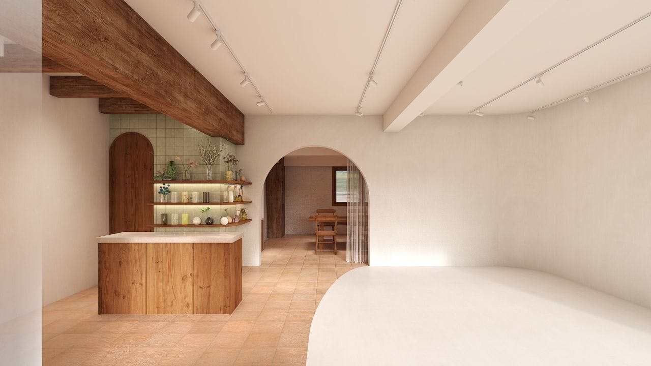 撮影スペースとレッスンスペースを大きなアーチ開口のある壁で隔て、2つの世界観を作ります。