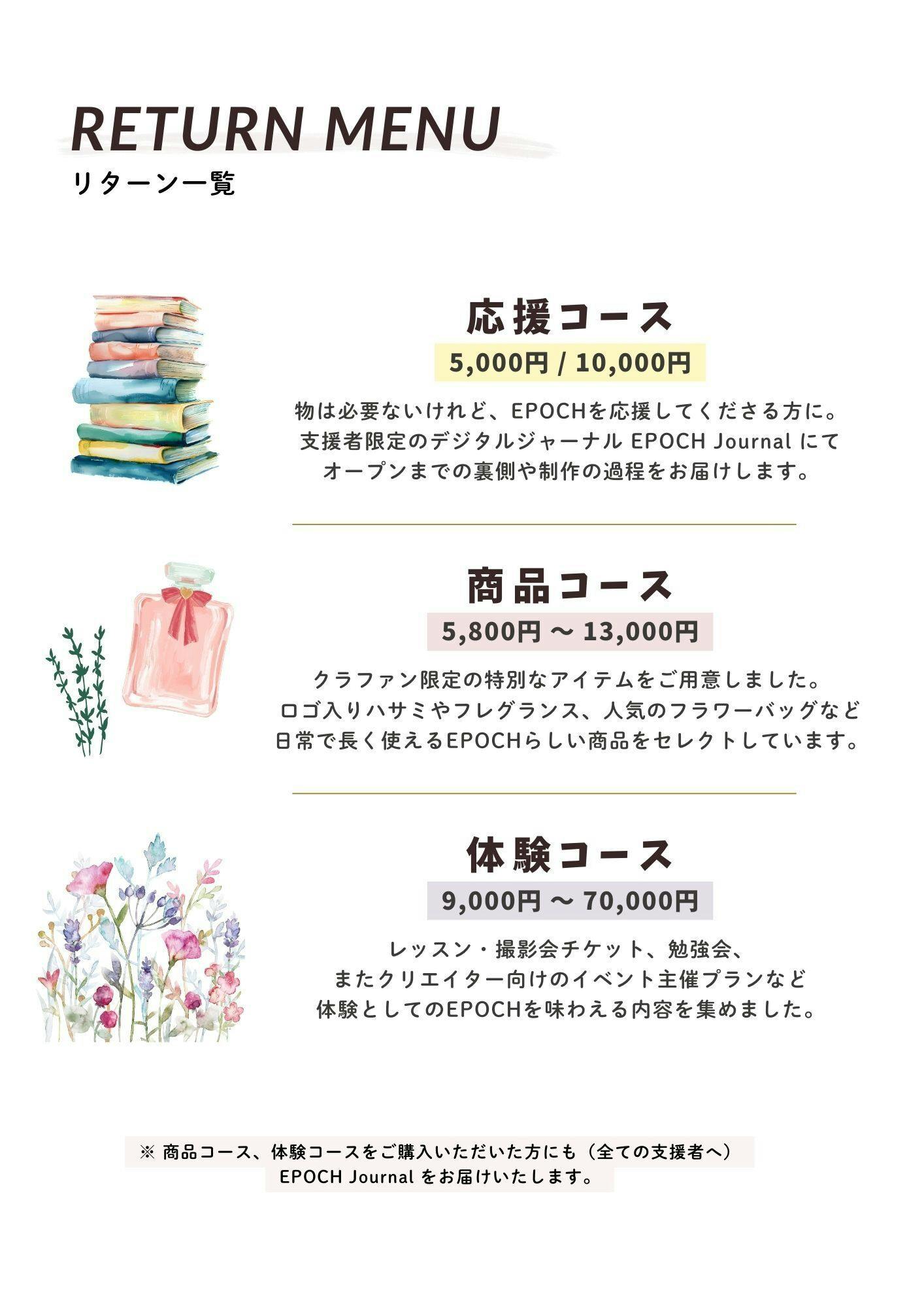 応援コースに記載している EPOCH Journal は、オープンまでの裏側や店舗が出来上がるまでの物語を支援者限定でお届けするデジタルジャーナルです。( 全ての支援者様へ EPOCH Journal をお届けします。)