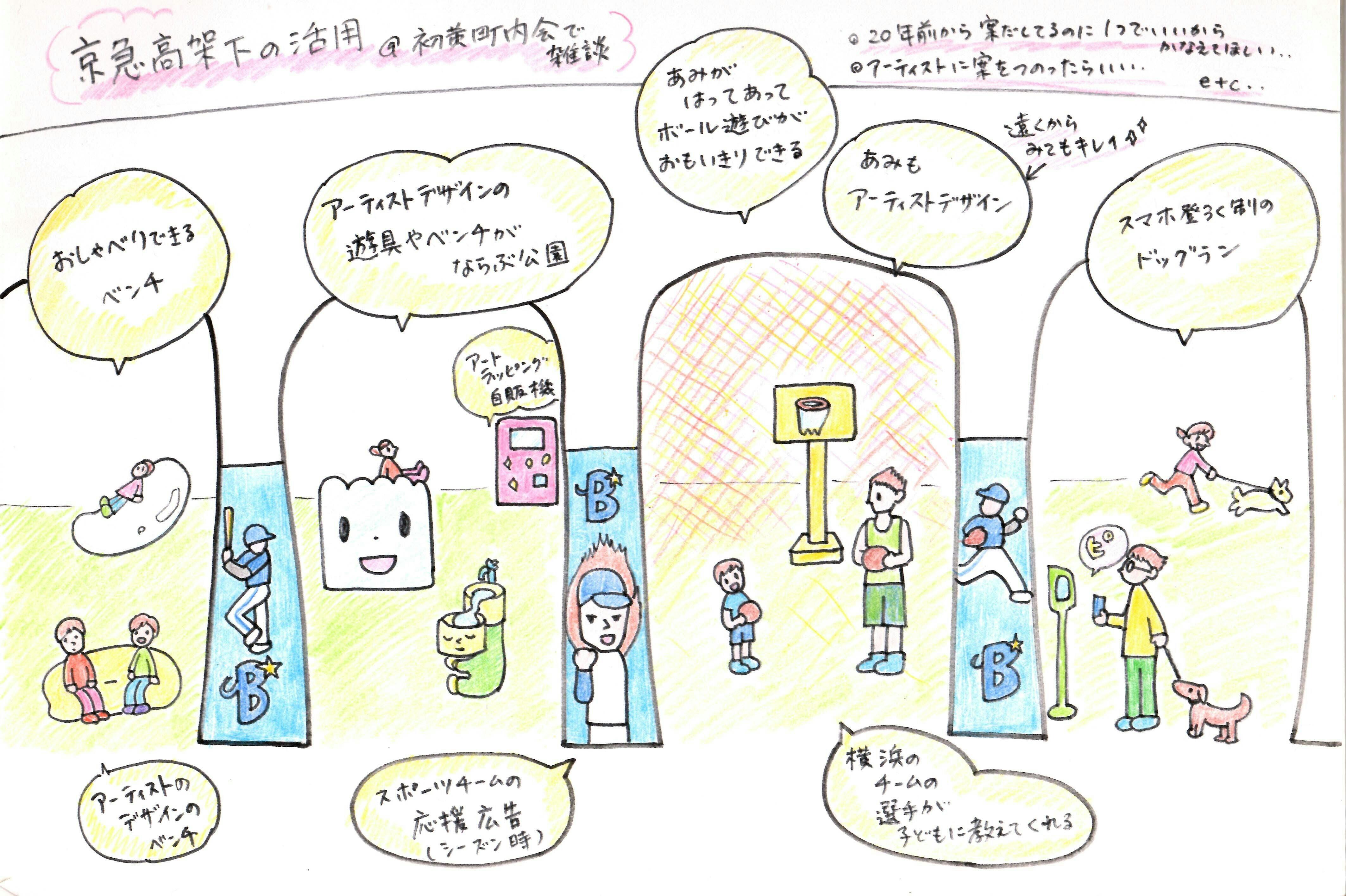 その中で、まちづくりに参加している京急電鉄さんと一緒に町内会をまわり、高架下の空きスペースにの活用方法について意見を募り、一枚の絵にまとめました。