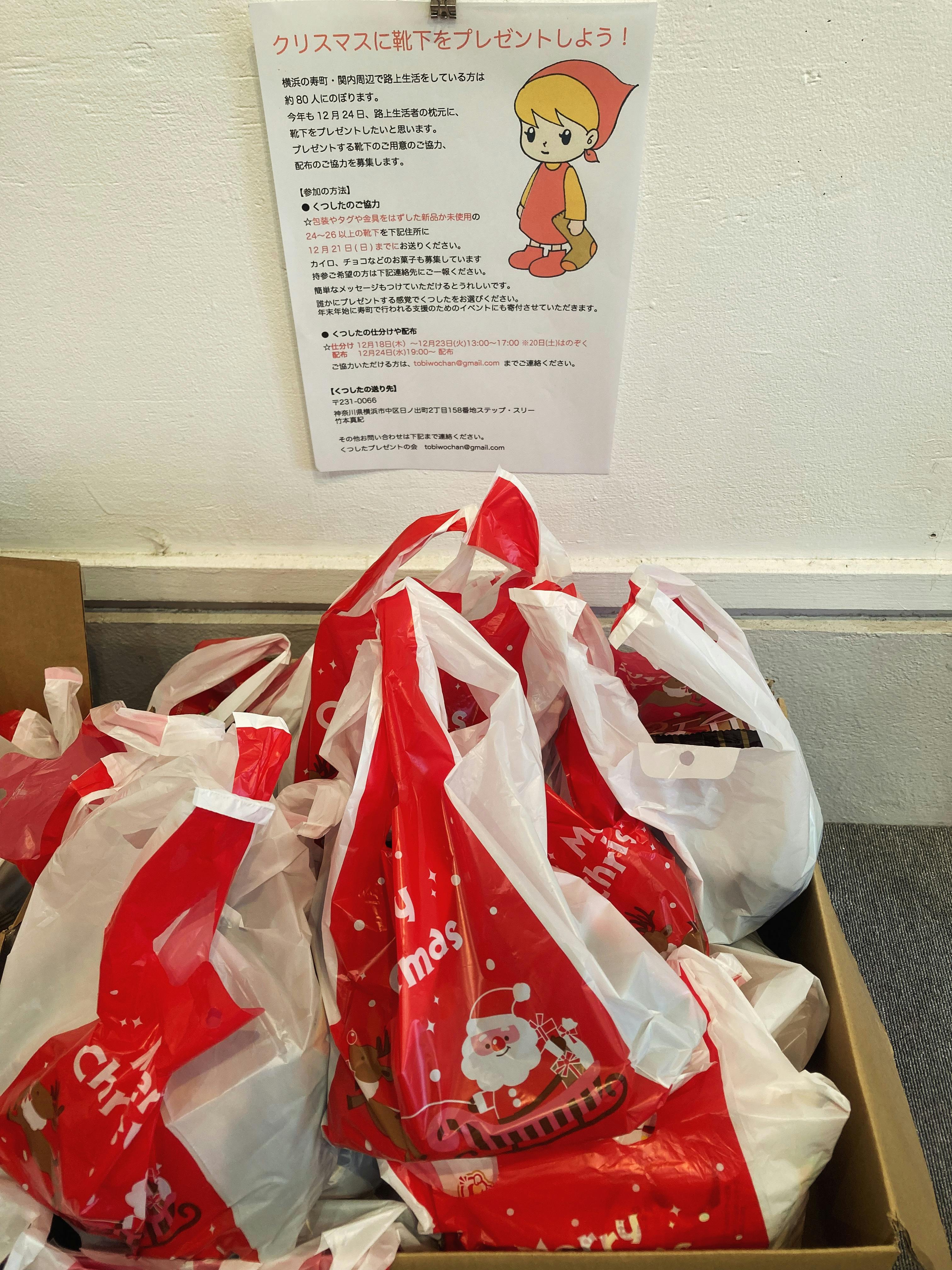 2015年12月のクリスマスイブから路上生活者の方に靴下をプレゼントするプロジェクトを始め、今年で10年目になります。