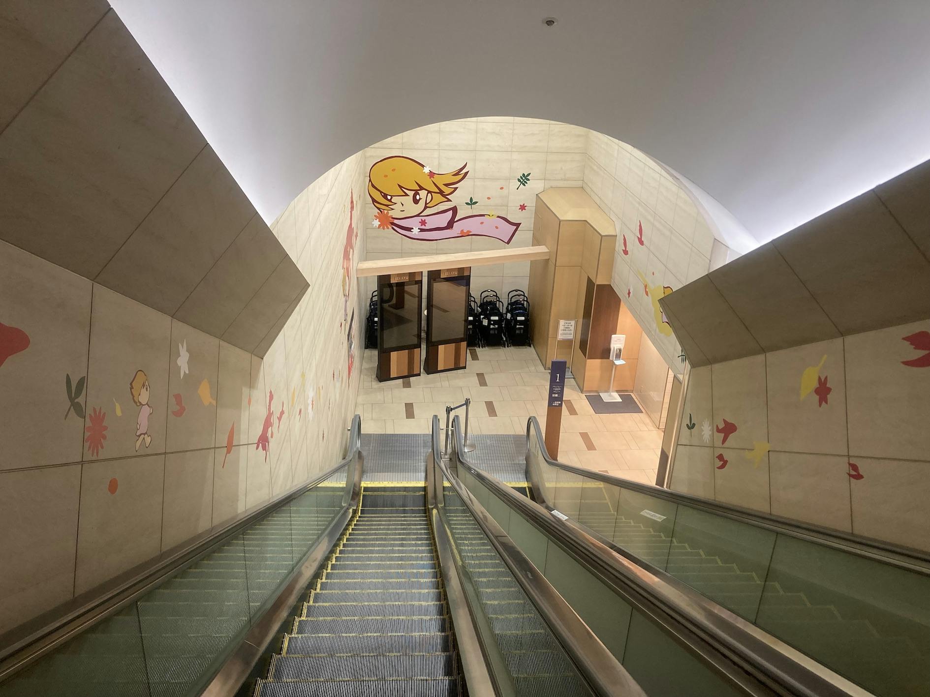 2008年から黄金町のアートディレクターをしてきた山野真悟さんからの提案で、この1Fから3Fまでの長いエスカレーターで何か考えるように言われ、実行したのが評判になり、今では季節ごとの入れ替えで常設展示になりました。