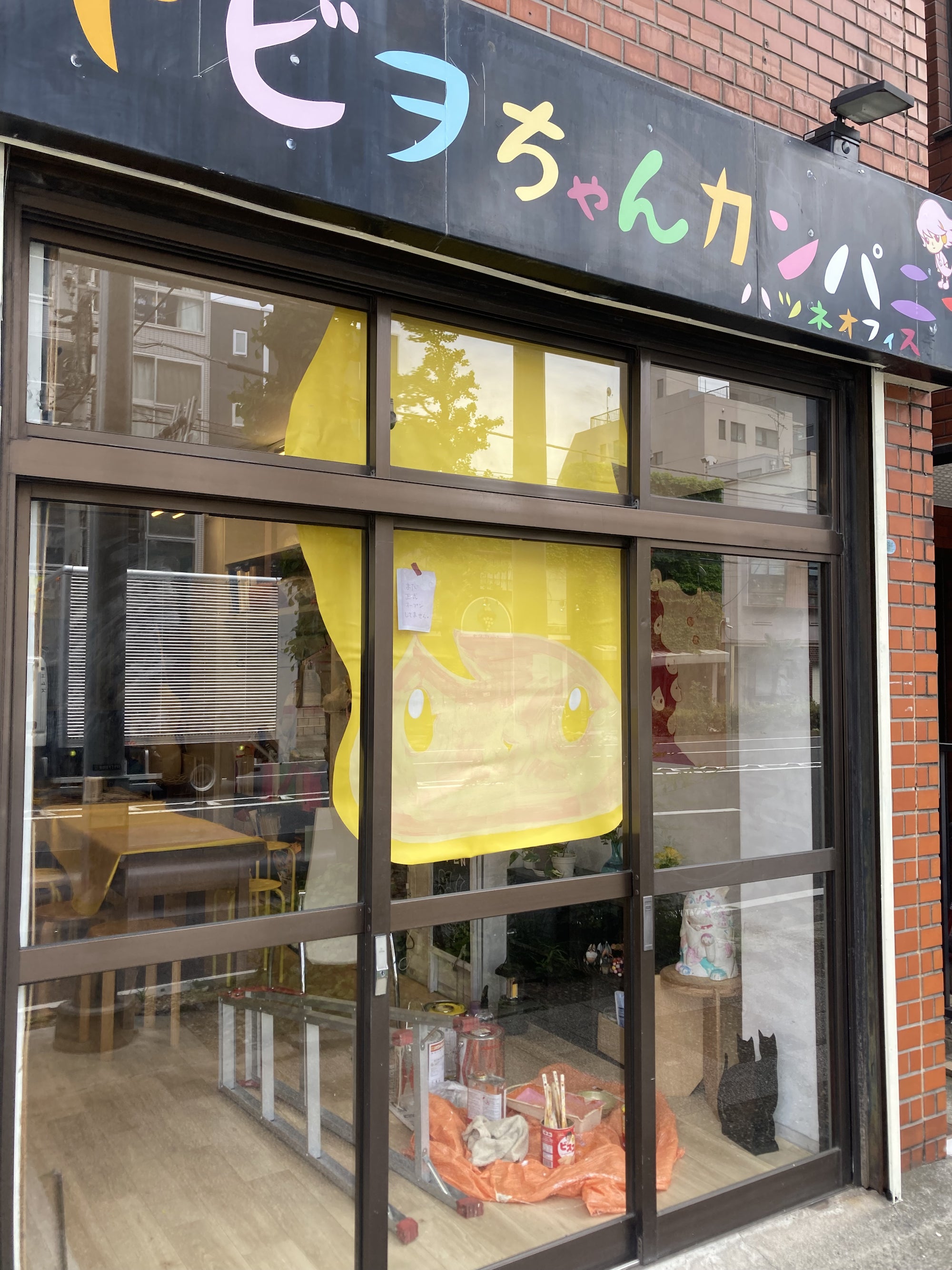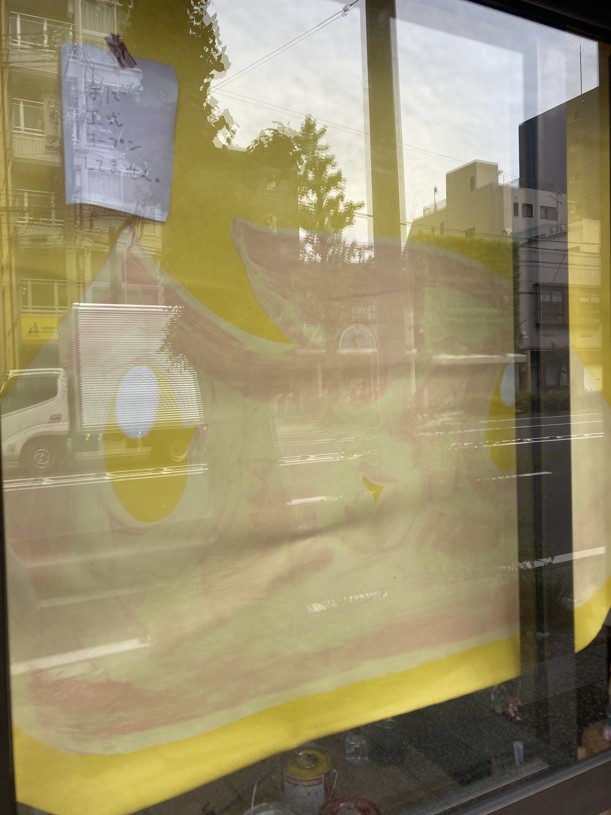 まだどこに何があるやらわからないままで、散らかっており、工具や強い塗料が置いてあり、危険なこともありまして、正式オープンができませんので、表に向かって黄色いトビヲちゃんをさげています。