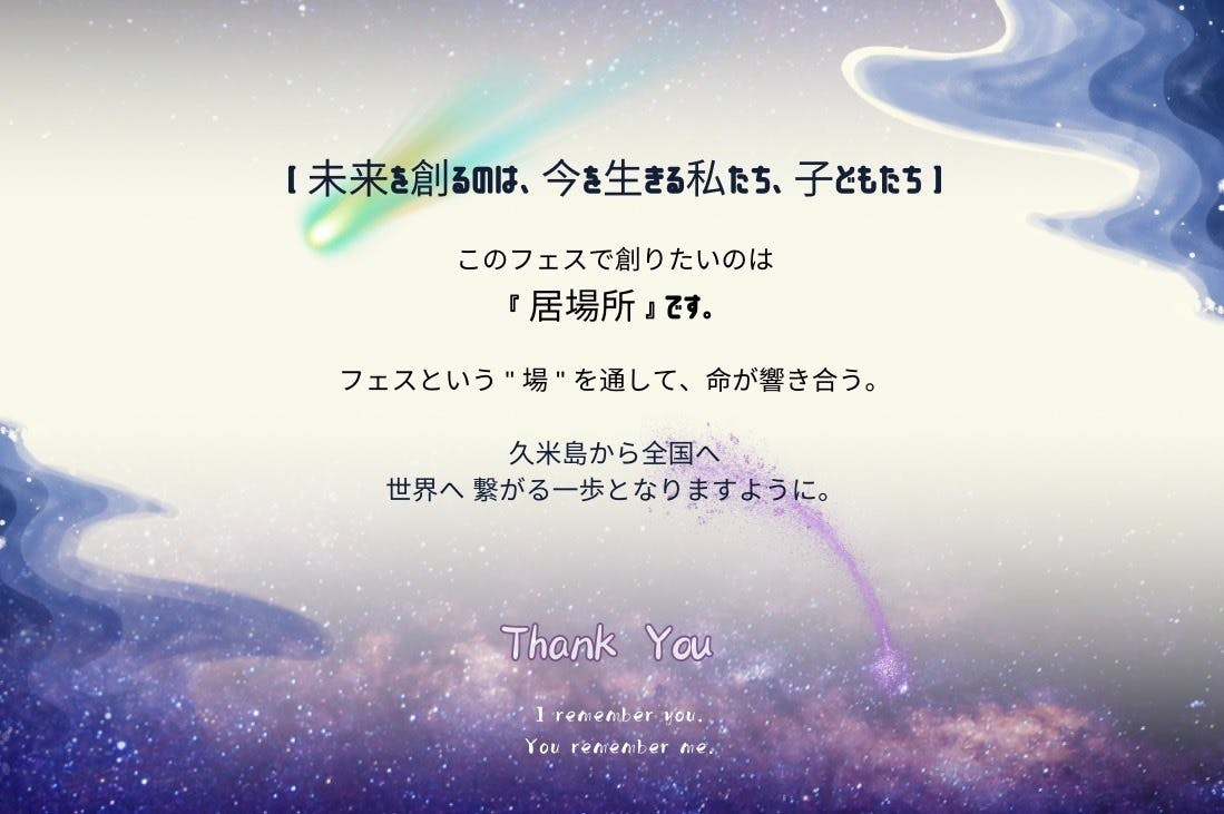 大人もこどもも、自分を丸ごと解放して、心から笑い、泣き、響きあう。"いのち"が喜ぶ体験が詰まった、久米島発のフェスティバルを開催します!!✩自由に走って ✩涙して ✩魂がふるえる日。『遊ぶ』『表現する』『つながる』誰もが在りのままの存在でいられる『居場所』を共創しませんか?