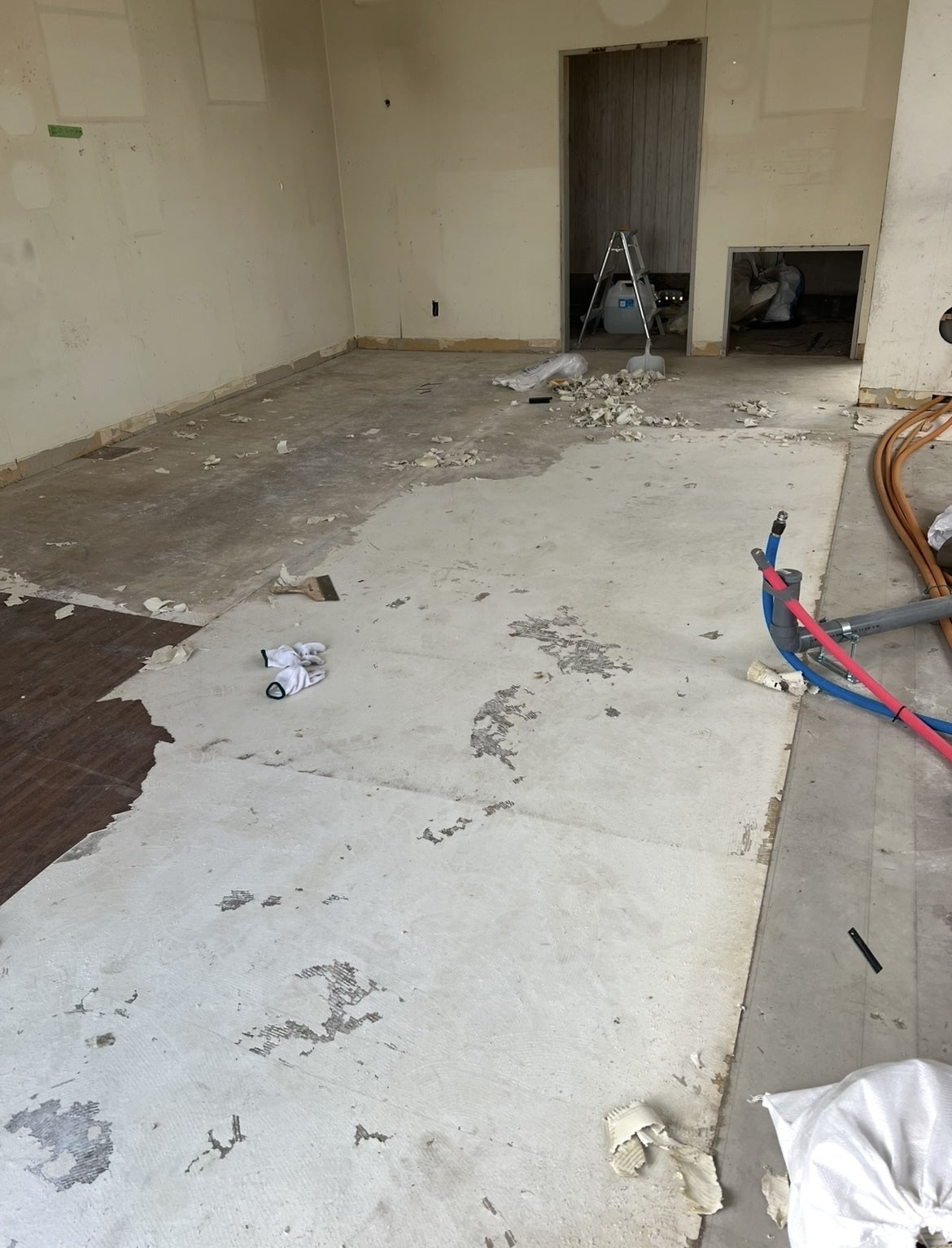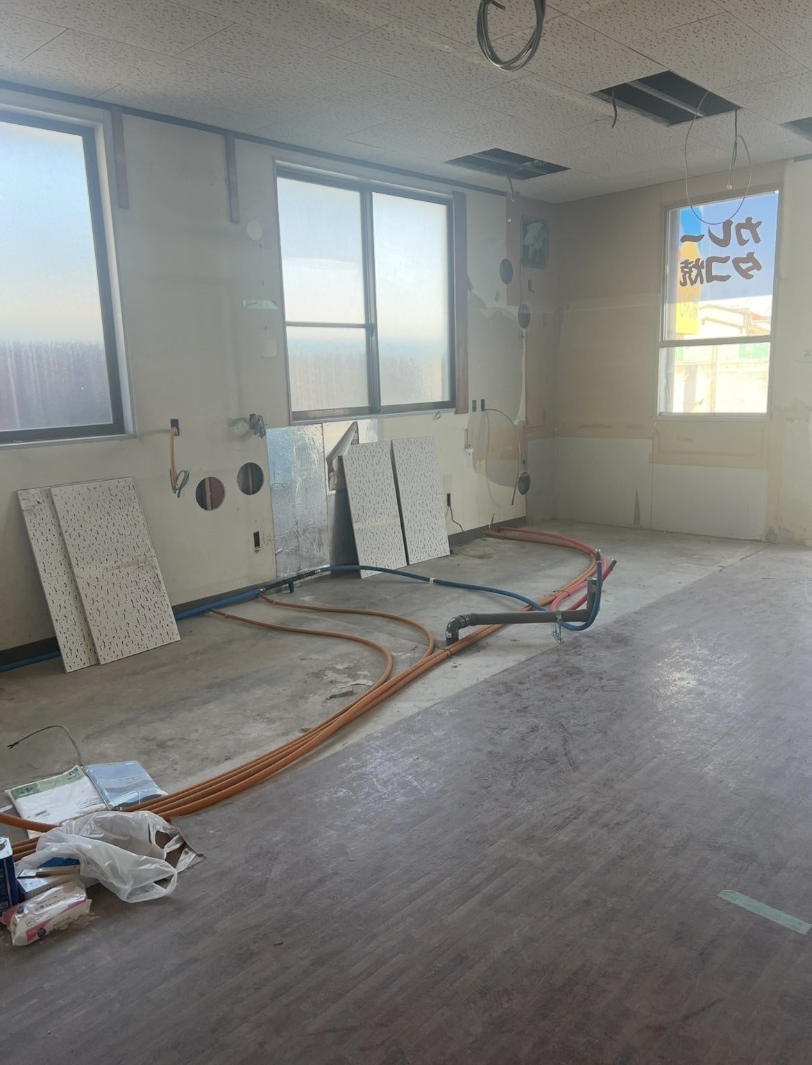 配管工事と既存のフロアシートを剥がしてもらいました!