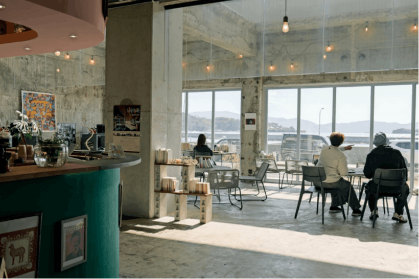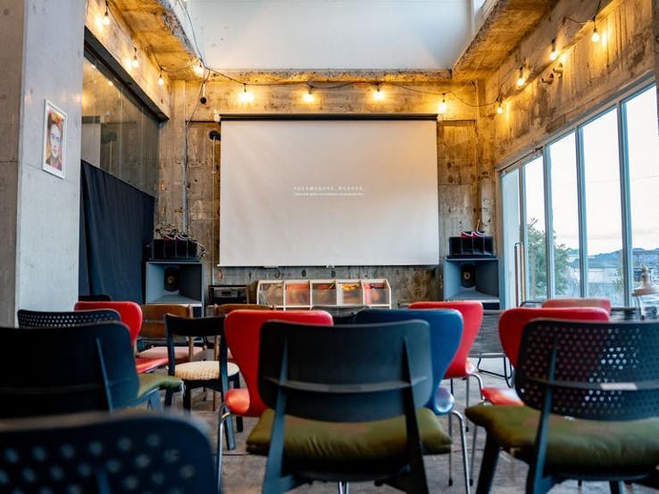 みんなの理想や創造が膨らむ空間として、ぜひとも牛窓テレモークの中にミニシアターを作りたいのです。ただ、そのために大きな設備投資をして、というのは現実難しい。そこで、建物内にある海に面した吹き抜け空間、昼間はカフェのお客様席として使っていますが、こちらに空調、暗幕、スクリーンと映写機の設備を整え、カフェシアターへと変えて行きたいのです。