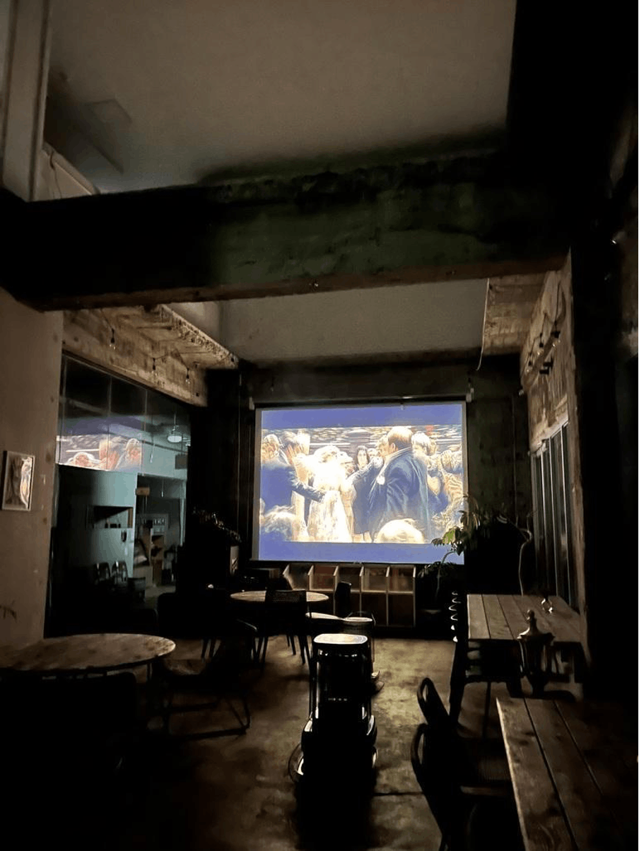 カフェ営業終了後、この空間をカーテンが取り囲みます。ゆったりとした椅子、ソファーに身を委ね、映画館に負けない映像と音響で映画を楽しみます。