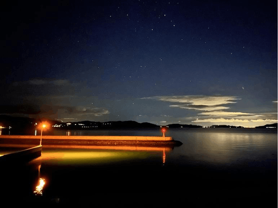 上映中はカフェのドリンクやスイーツ片手で大丈夫。映画が終わり、エンドロールが上がりきると、それまで仕切っていた四方のカーテンが上がり、お客さんは月明かりとあふれんばかりの星屑に満ちた牛窓の海に放り出されます。