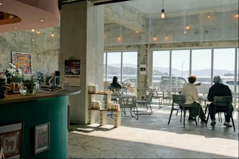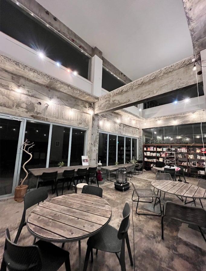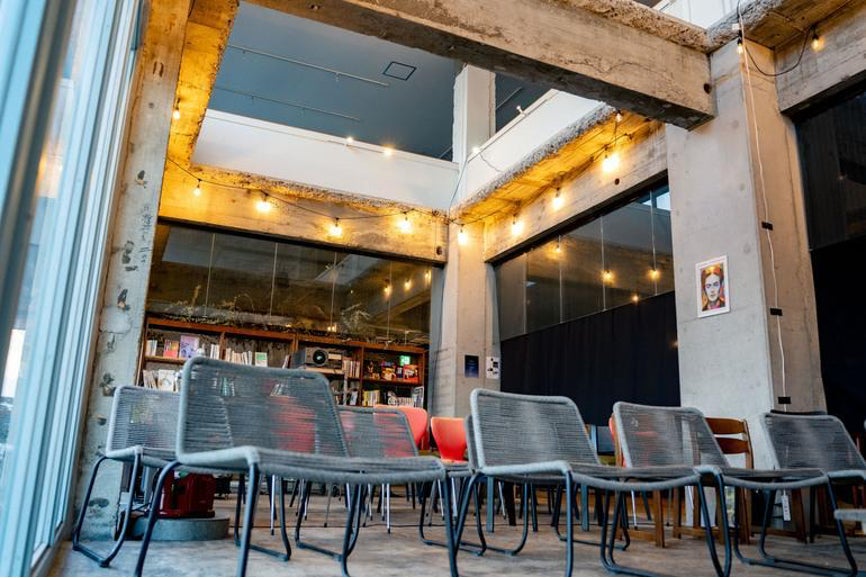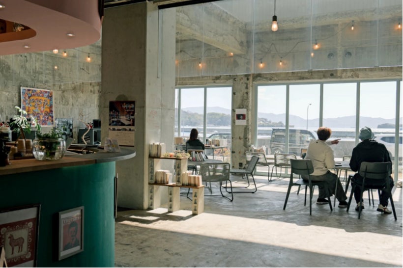 みんなの理想や創造が膨らむ空間として、ぜひとも牛窓テレモークの中にミニシアターを作りたいのです。ただ、そのために大きな設備投資をして、というのは現実難しい。そこで、建物内にある海に面した吹き抜け空間、昼間はカフェのお客様席として使っていますが、こちらに空調、暗幕、スクリーンと映写機の設備を整え、カフェシアターへと変えて行きたいのです。