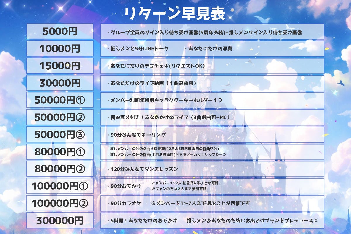 (支援金に応じて記載内容以外にも演出アップのために使用させていただきます。)
