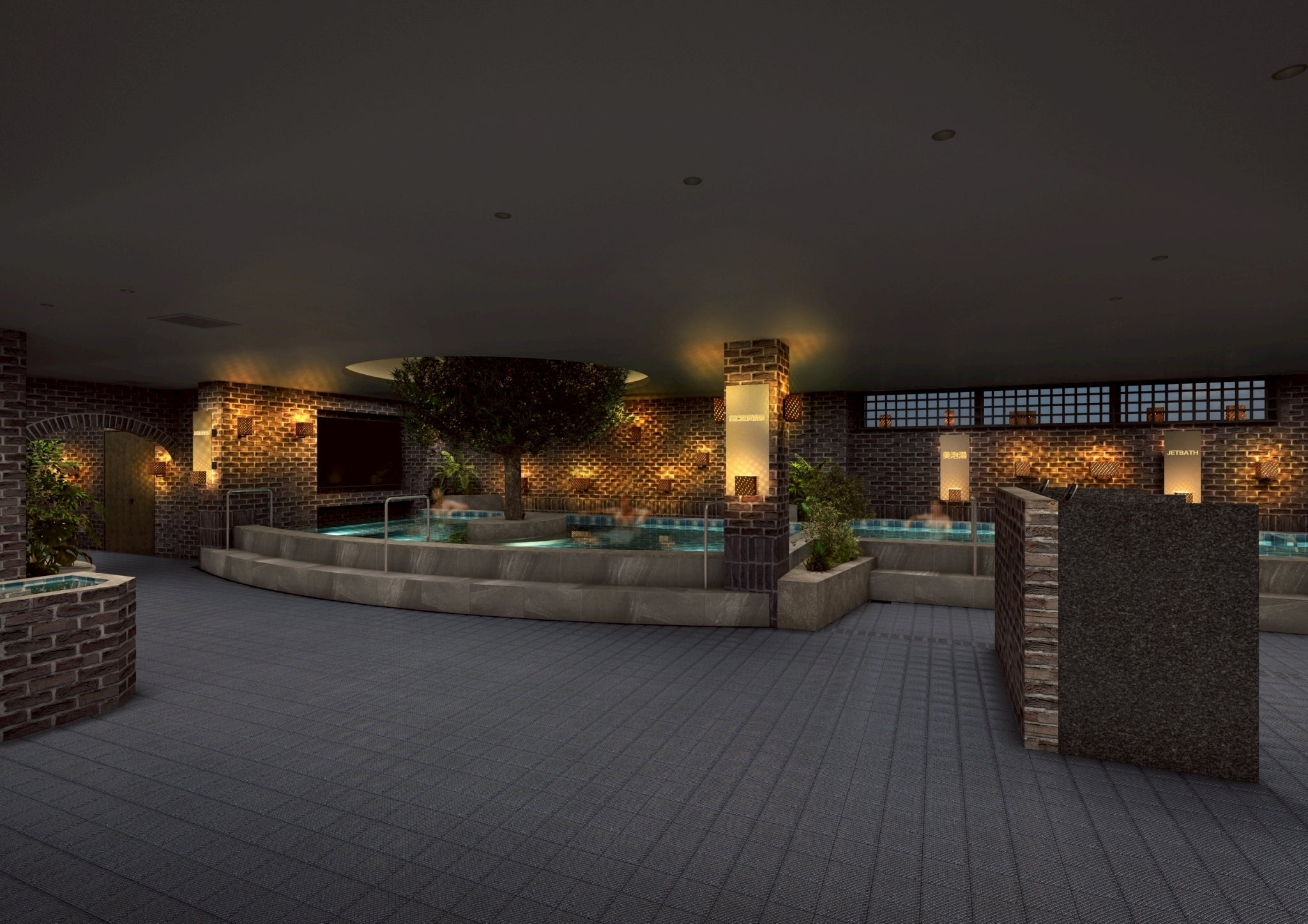 毎日サウナ東京 幕張店のシンボルツリーが佇む、特濃炭酸泉。サウナ東京比約1.4倍の広さ、炭酸量は約1.7倍。