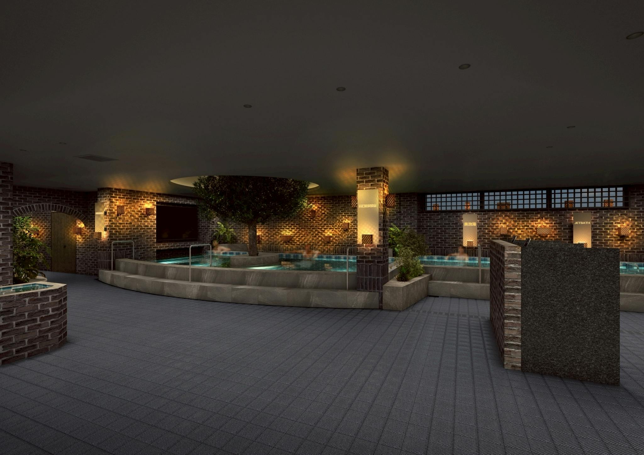 毎日サウナ東京 幕張店のシンボルツリーが佇む、特濃炭酸泉。サウナ東京比約1.4倍の広さ、炭酸量は約1.7倍。