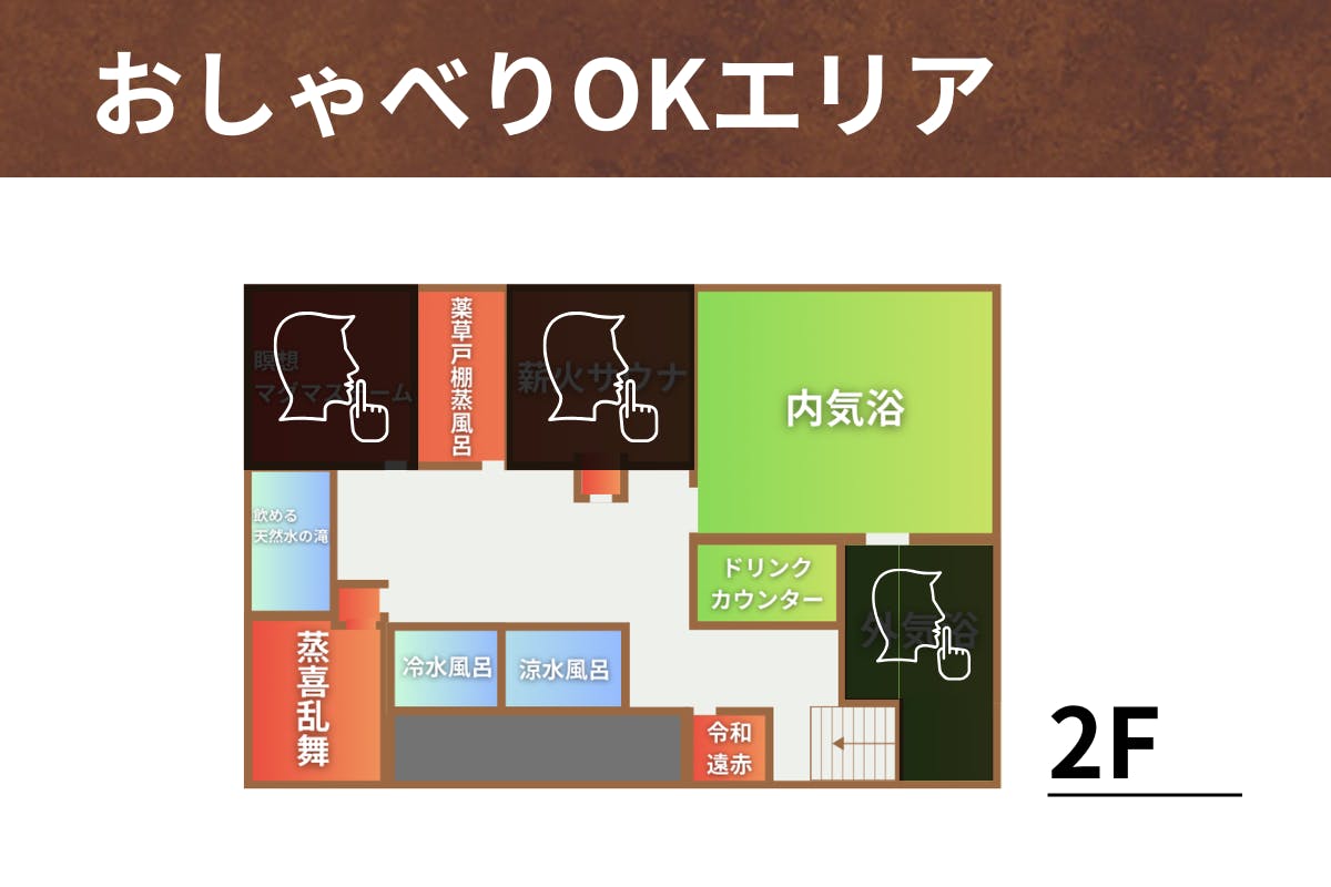 館内は、会話を楽しめるエリアと、静かに過ごす黙浴エリアを明確に分けています。