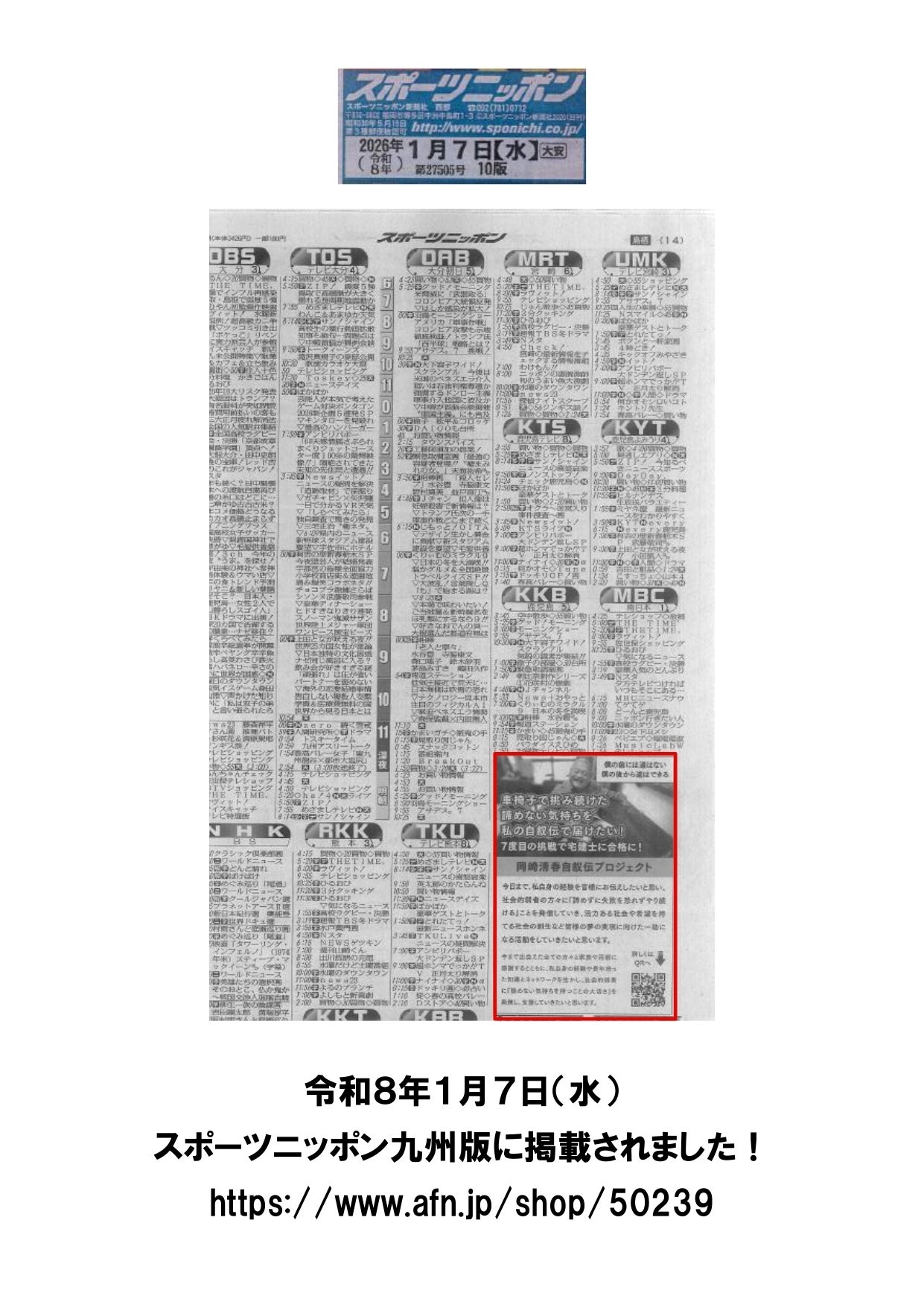 2026/01/14 17:13令和8年1月7日(水)、本プロジェクトが スポーツニッポン九州版 に掲載されました! 大手紙に取り上げていただけたことは、皆さまからのご支援と応援があってこそ実現したものであり、心より感謝申し上げます。記事では、私自身のこれまでの歩みや、自叙伝制作への思い、そして「諦めない気持ち」を多くの方に届けたいという願いを紹介していただきました。 この掲載をきっかけに、より多くの方々にプロジェクトの存在を知っていただき、共感の輪が広がることを期待しています。また、大きな反響をいただいており感謝しておりますが、現状はまだまだ厳しい状況です。 一人でも多くのお知り合いの方々に、このプロジェクトをご紹介いただけましたら大変励みになります。引き続き、皆さまの温かいご支援をどうぞよろしくお願いいたします。 進捗があり次第、随時ご報告させていただきます。 もっと見る