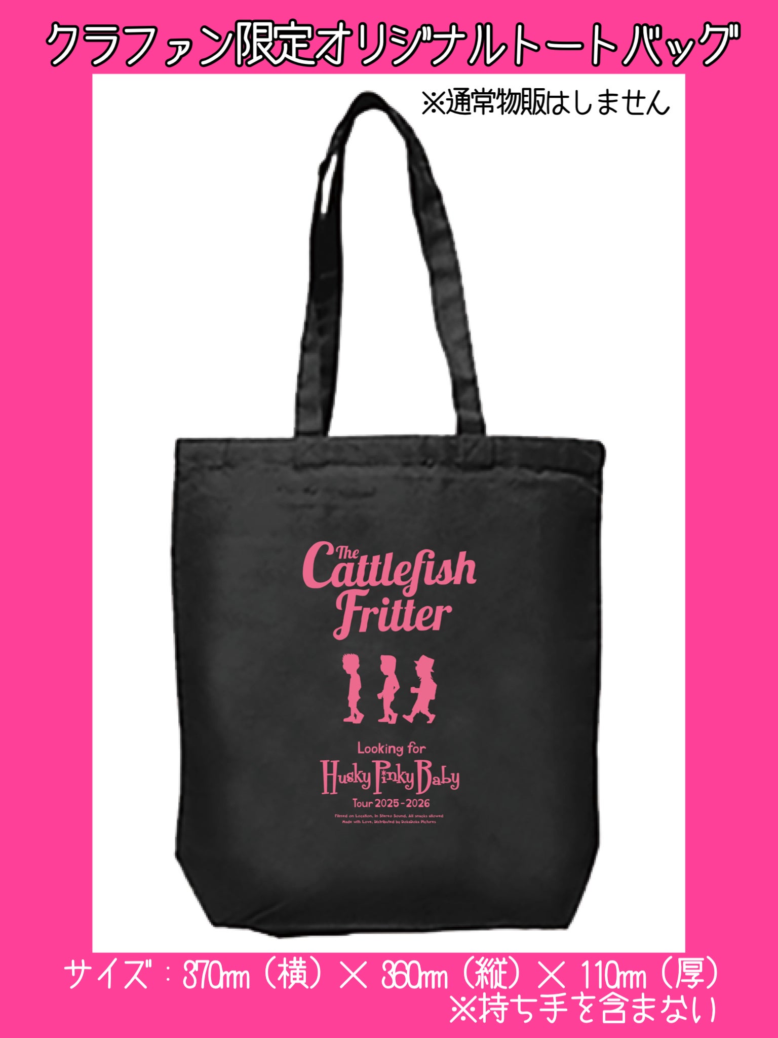 皆様、あけましておめでとうございます!今年もイカフリをよろしくお願いします!!さあさあ、年明け1発目の活動報告はコチラ!!コウイカコース / ケンサキイカコース / スルメイカコースのリターンに含まれる「クラファン限定オリジナルHPB tourトートバッグ」のデザイン完成のお知らせ!こちらもクラファン限定Tシャツやクラファン限定アクリルキーホルダーと同様、通常物販では入手不可能なモデルとなります。クールなブラックベースにポップなピンクのシルエットタイプのロゴ&イラストを施した、50'sテイスト溢れるお洒落な仕上がりとなっております。普段使いにも超おすすめ!ご購入済みの方はお楽しみに!!「え?欲しい!」と感じた方は是非この機会にご購入くださいませ!!このクラファンも残り期間が短くなって参りました。引き続き、あたたかい応援をどうぞよろしくお願いいたします!↓詳細サイズ↓