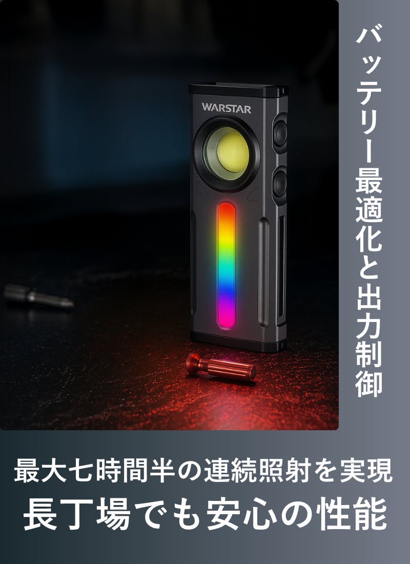 バッテリー最適化と出力制御により最大七時間半の連続照射を実現