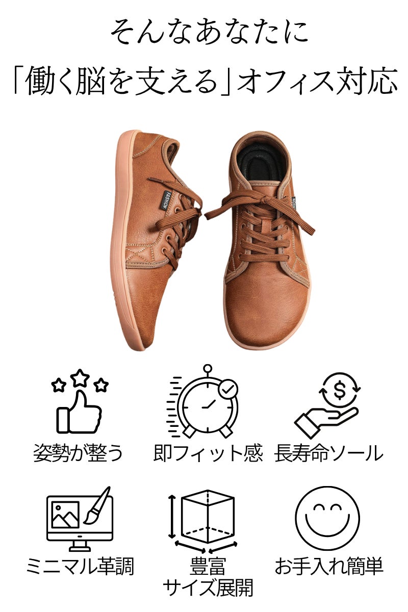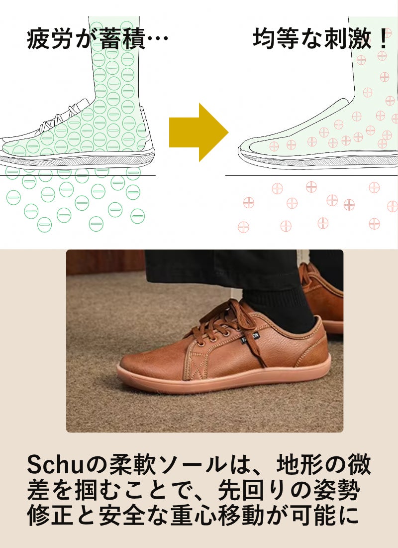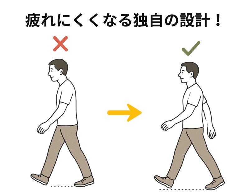 歩行時の衝撃が“ゼロ”ではなく、“ちょうどよく伝わる”よう設計。足底筋がこまめに使われることで、自然と体幹が意識される感覚へ導きます。デスクワーク中心でも、移動時間がそのまま「プチトレーニング」になります。