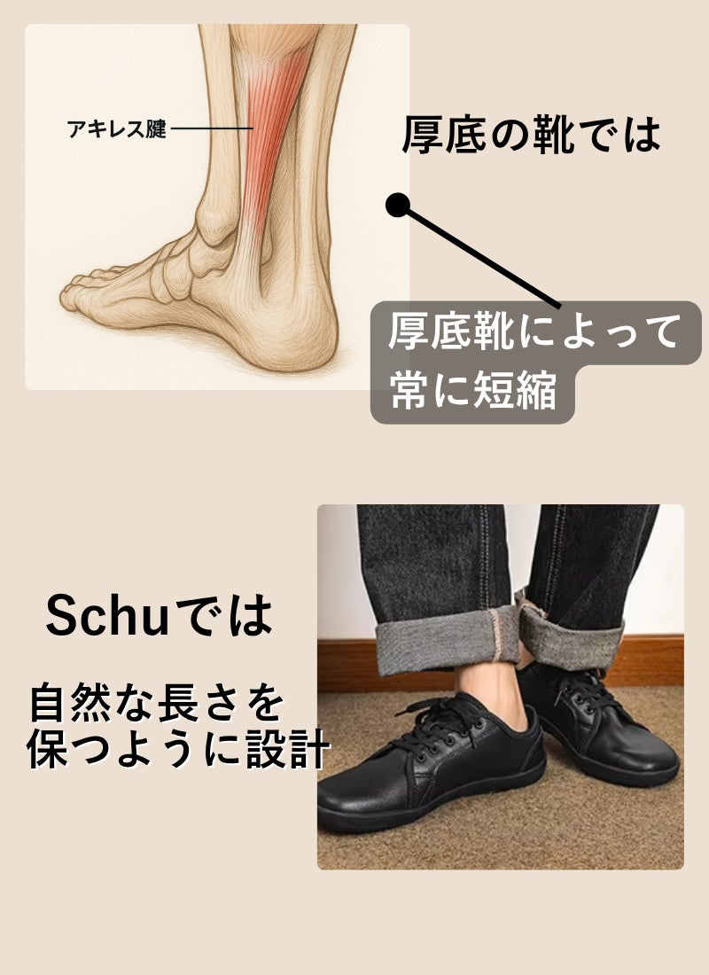 現代の多くのビジネスシューズは、かかとが高く、つま先が低い“ヒール差(ドロップ)”が存在します。この構造は見た目のフォーマルさを演出する一方で、長時間履き続けると以下のような不自然な姿勢を生み出します。
