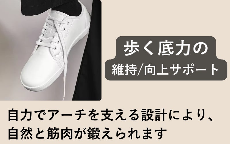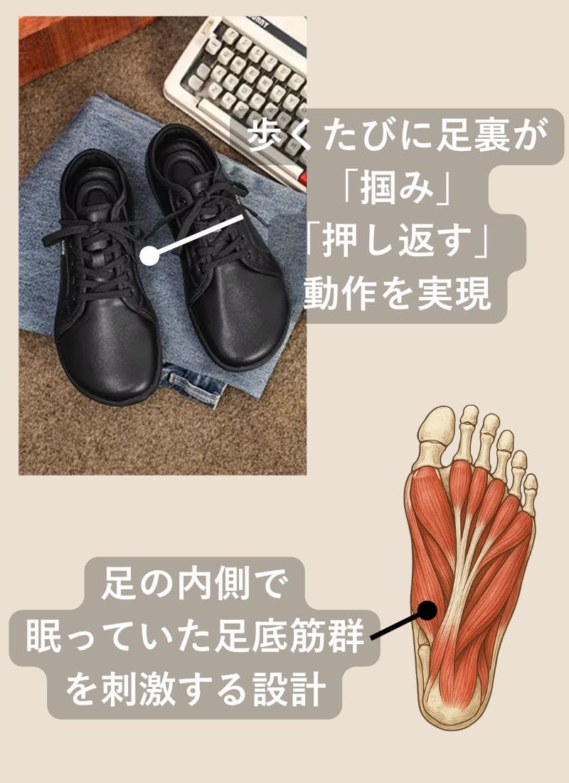 歩くたびに足裏の筋肉に生まれるごく小さな「微振動」を逃さずキャッチし、体幹のスイッチオンをサポートする設計です。クッションを厚くしすぎず、適度な反発と柔らかさのバランスを追求することで、足底筋がきちんと働く環境を整えています。