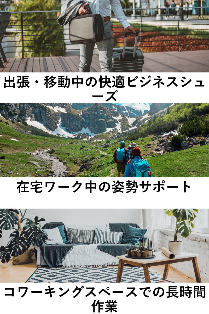 ビジネスシーンで使うからこそ、足元のデザインは“機能的であること”と同時に“洗練されていること”が重要です。本製品は、スーツやオフィスカジュアルに自然となじむミニマルデザインを採用しています。