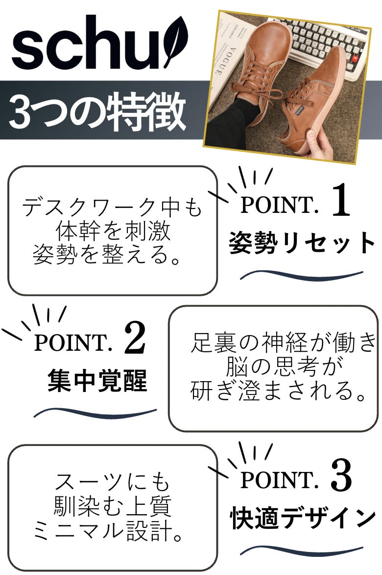 従来の革靴は素材や構造の関係で重くなりがちです。1歩あたりの負荷が増える(数千〜1万歩で大きな差)。重量が疲労の“見えない主因”になっているケースは多いです。