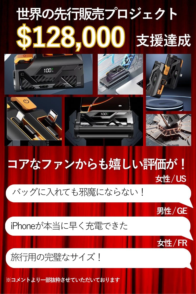 ・使用方法・・・本体充電後、格納された接続プラグを端末に差し込むと充電開始。本体はType-Cプラグを差し込むと電源から充電開始。