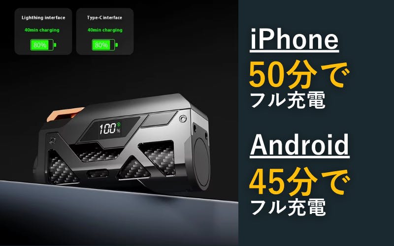 ※弊社調査では、最新iPhoneを約50分でフル充電」「Type-Cスマホを約45分でフル充電