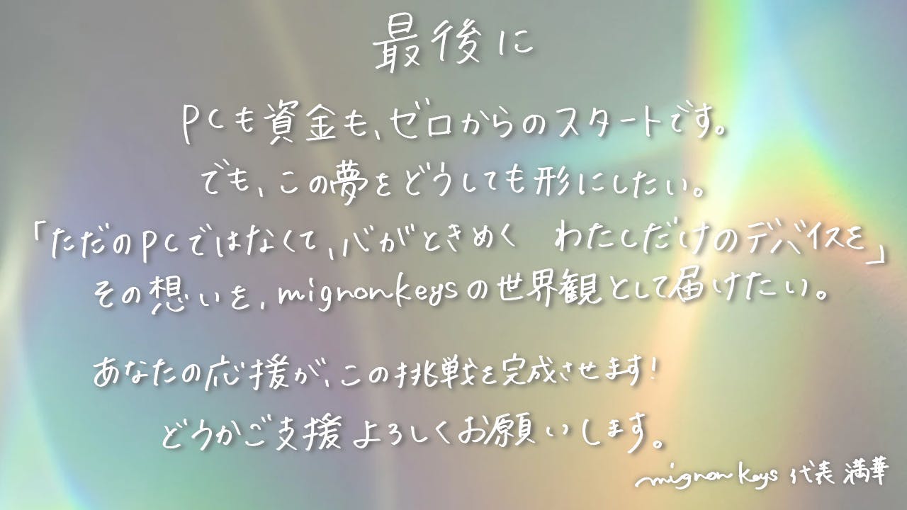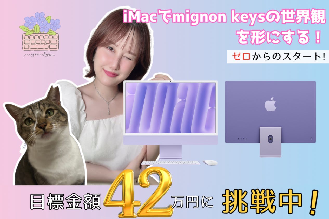 mignon keys の世界観を形にするため、iMac(M4/32GB/1TB)を導入し、制作環境を整えるためのクラウドファンディングです。