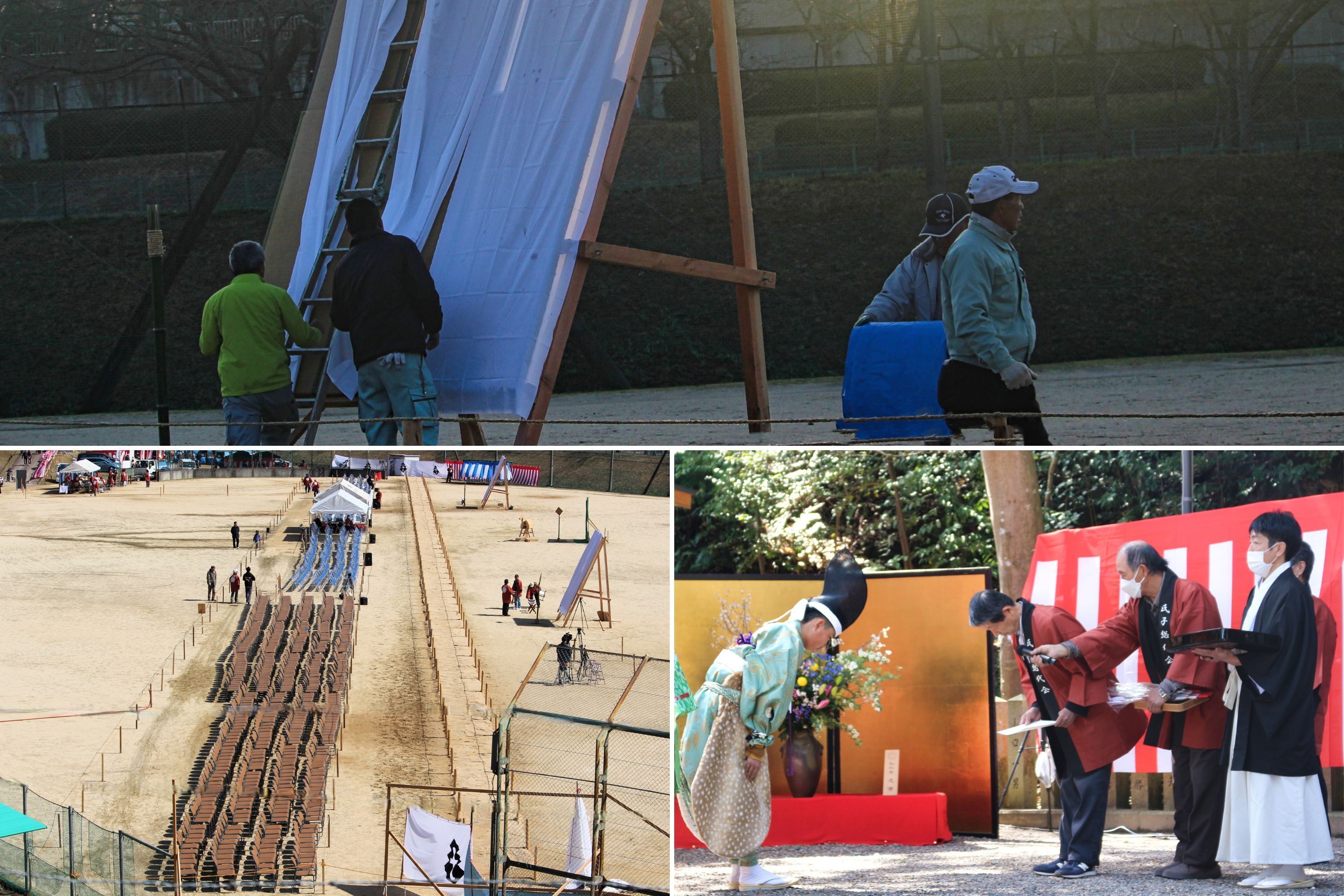 流鏑馬保存会は会場設営、子ども流鏑馬などの準備・運営を行っている