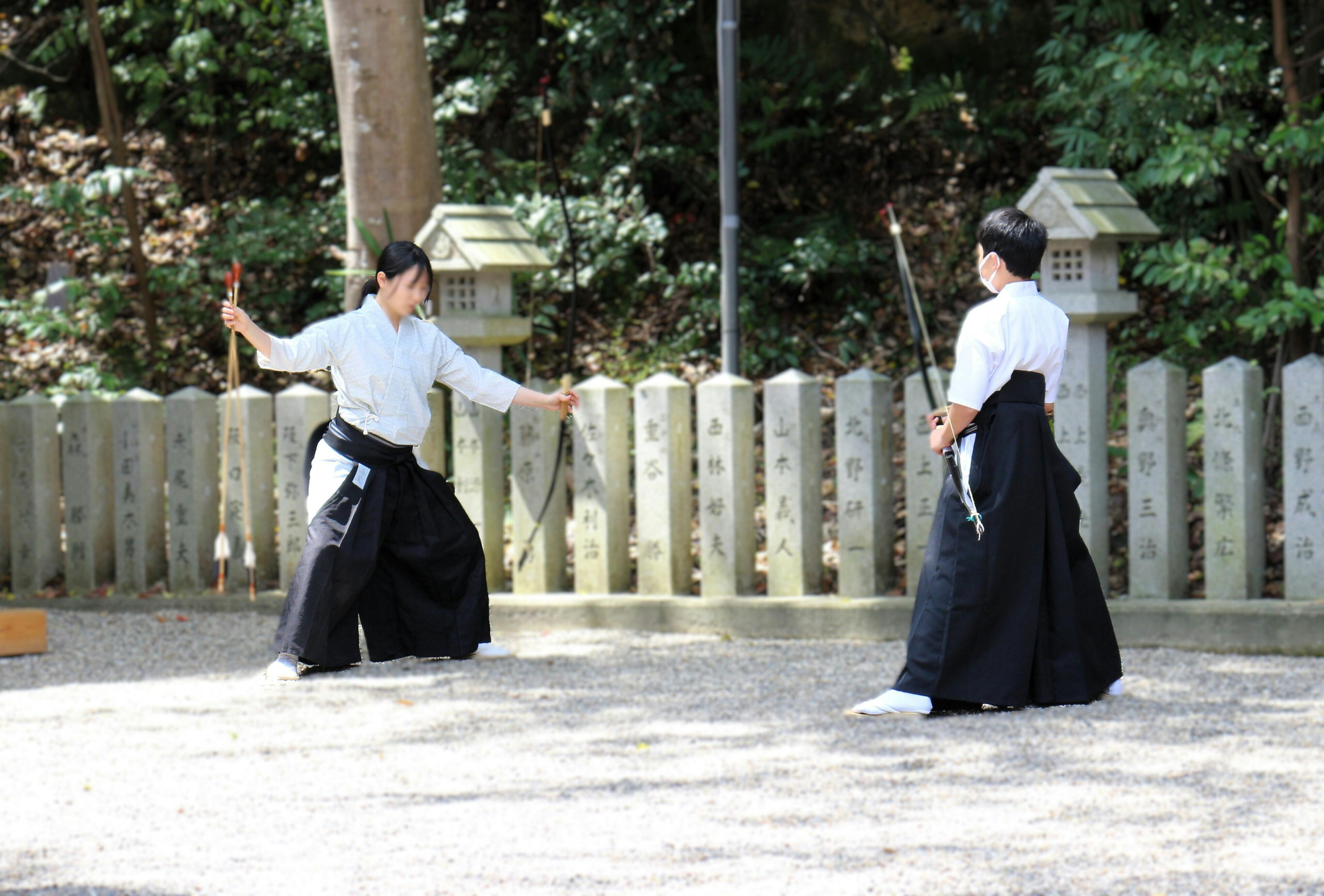 これは、木馬に乗り、弓を射るための動きを身につける稽古の一場面です。馬も木馬も使いませんが、馬上での姿勢、体の使い方、弓を引く感覚を確認しています。馬上で矢を放つためには、その前に、地上で整えておくべきことが数多くあります。一見すると地味な稽古ですが、こうした「乗らない日の積み重ね」が、あの流鏑馬の一瞬を支えています。見えにくい準備の時間も、皆さまのご支援によって続けることができています。