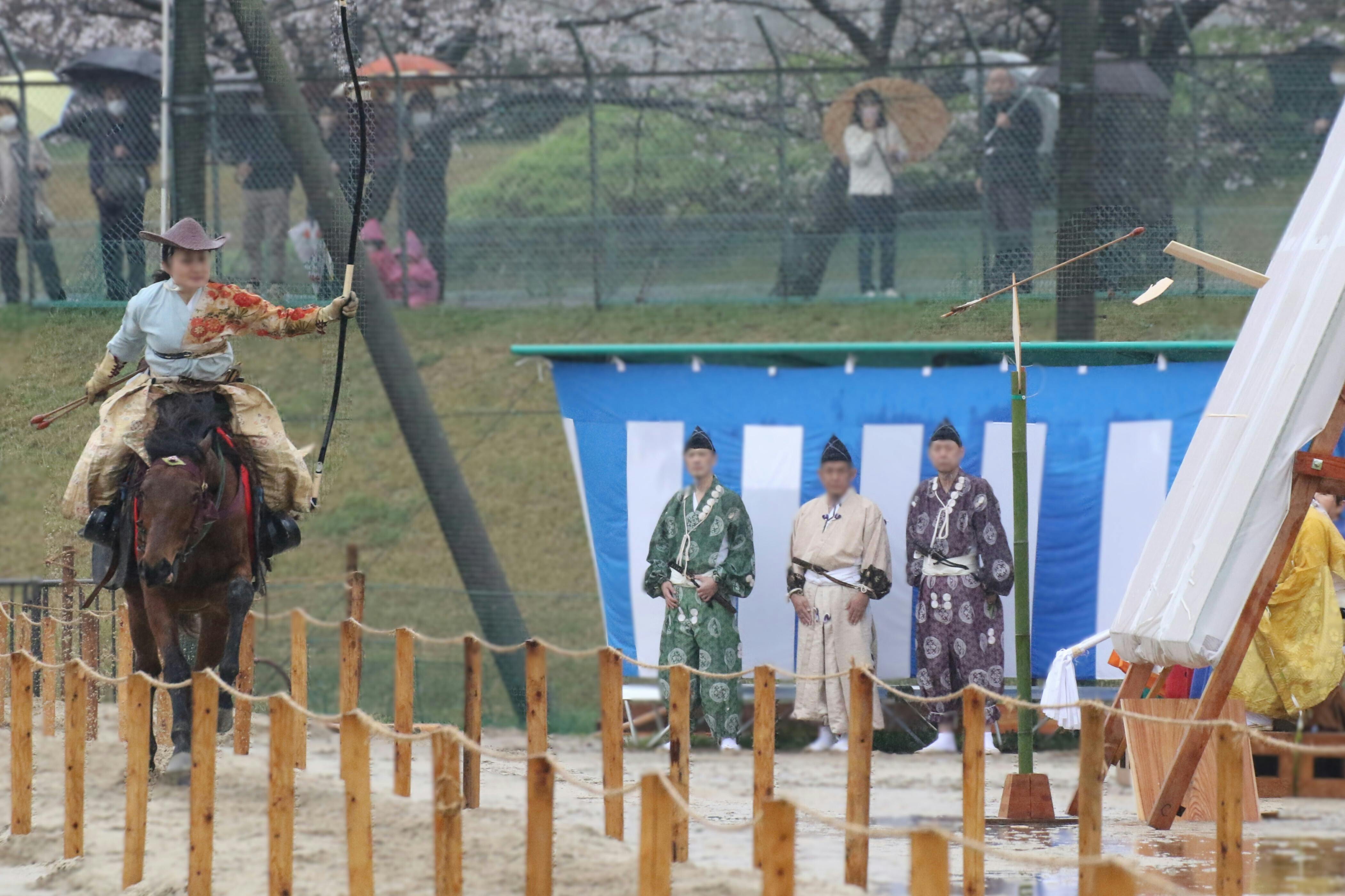この写真は、第3回流鏑馬まつり当日の一場面です。雨に濡れた馬場、緊張感のある空気の中で、射手は馬上から矢を放ちます。ここに至るまでには、馬に乗らない日の稽古、木馬での練習、礼法や朝練など、静かな時間が幾重にも積み重なっています。当日は、その積み重ねが一気に試される日です。うまくいくこともあれば、思うようにいかないこともある。それでも射手は、これまでの稽古を信じて、この場に立ちます。華やかに見える流鏑馬の一瞬は、決してその場限りのものではありません。長い稽古の時間があってこそ、初めて成立します。こうした準備と積み重ねを続けることができているのは、皆さまのご支援があってこそです。稽古の時間も含めて、流鏑馬まつりを支えていただいています。