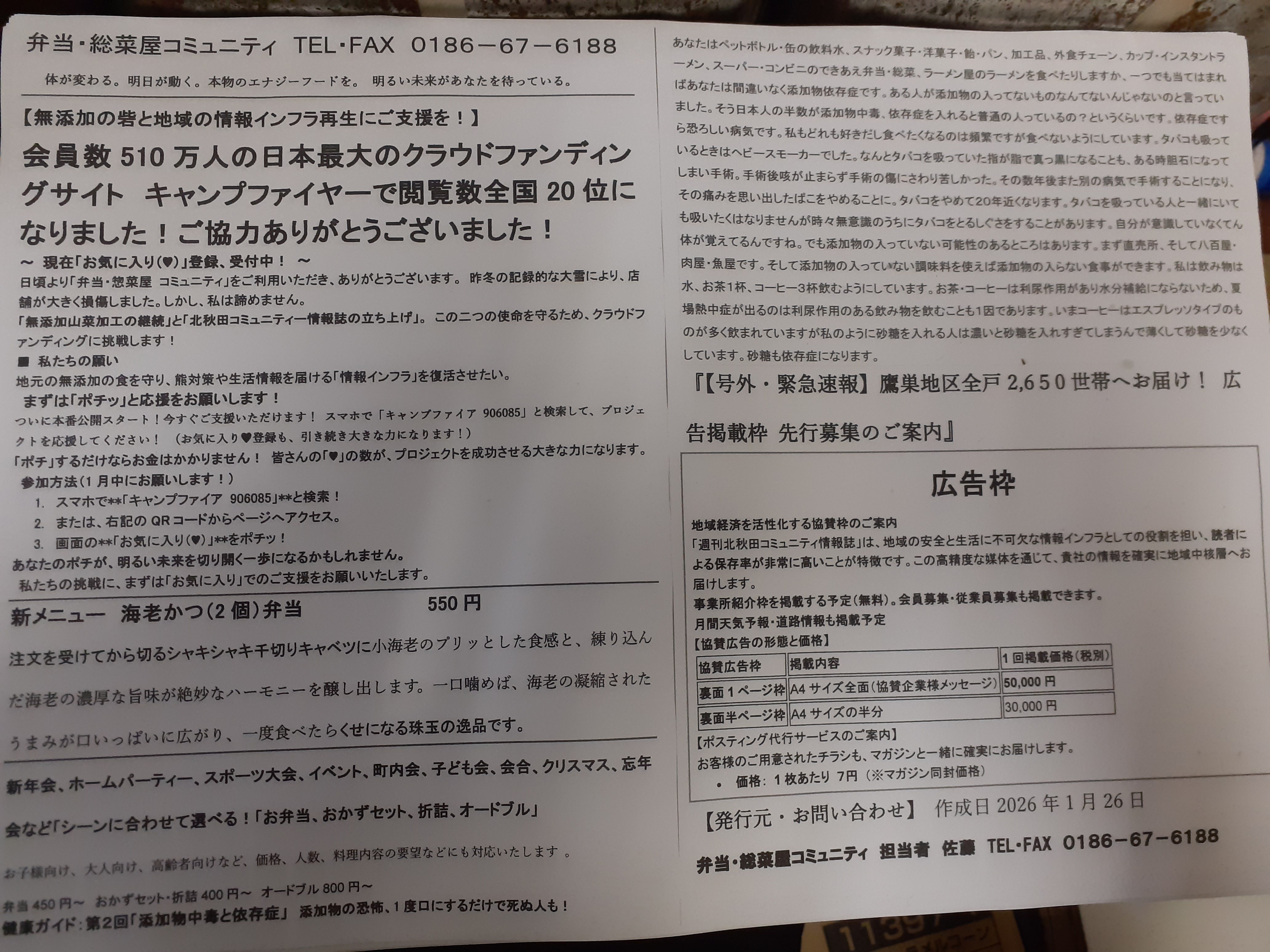 2026/01/26 23:05今日の北秋田は5日連続の大雪がおさまり、普段は広い道路のあちらこちらに除雪の山ができ車1台ようやく通れるくらい隙間ができるあがり、除雪につかれたのか車も人も見かけない、あの痛々し気なお年寄りたちも見かけない静寂に包まれています。そんななか編集・印刷、北秋田コミュニティ情報誌号外1月26日号発行しました。早速、明日当店の見守り隊によりあなたのところへお届けします。 もっと見る