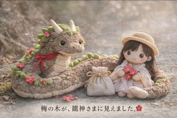 2026/03/28 16:16「梅の木が、龍神さまに見えたんです」そう言って送られてきた一枚の写真。そこに写っていたのは、長く横たわる梅の幹。けれど不思議と、ただの木には見えませんでした。うねるような姿。地を這うような流れ。まるで、いのちがそのまま、かたちを変えて現れているような――龍神さま、あらわる。そんな存在感がありました。あの日、森で見た赤。切られたばかりの断面に宿っていた、あの鮮やかな色。それは、ただの樹液ではなく、これから咲くはずだった花の色であり、そして、いのちの奥からあふれ出た、強いエネルギーのようにも感じられました。「龍神さまだったんですね」ゆっきーさんのその一言で、すべてが静かにつながっていきます。「赤龍」は、火のエネルギー。情熱的な行動力をもたらす存在。もし、この出来事に意味があるとしたら――それはきっと、“進みなさい”という後押し。紅梅は、切られて終わりではなく。枝は、染めとなって布へ。幹は、手に触れるかたちへ。そして、そのいのちは、次へとめぐっていく。ゆっきーさんは、切り株に養護剤を塗り、「ここからまた、新しい芽が出ますように」と、そっと願いを込めてくれました。そして、その色は――スカーフになりました。咲かなかった花の色が、いま、やさしくひらいている。「天女の羽衣みたいだね」そう言ってくれたのは、19歳の息子さん。その言葉に、この出来事の意味が、ふっと重なります。これはただの布ではなく、いのちを受け取り、身にまとうもの。「これからは、この梅の命と共に」そう綴られた言葉に、すべてが込められていました。そして、あとから届いたもう一つの言葉。「なぜか涙があふれてきました。きっと梅の木の精からの涙ですね。感謝の涙です。」龍神さまとして現れた紅梅は、咲かなかった花の色を、別のかたちで咲かせながら、いま、暮らしの中で、やさしく息づいています。終わりではなく、はじまりとして。別れではなく、めぐりとして。そのいのちは、いまも、確かに続いています。 この“命のめぐり”を、あなたも受け取ってみませんか。 もっと見る