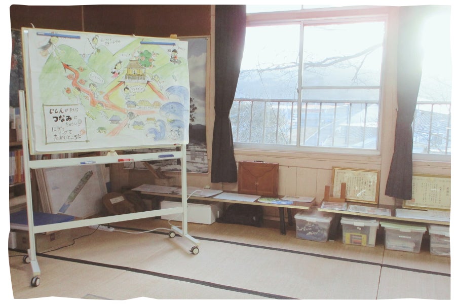 社務所の2階に通されたとき、目に飛び込んできたのが、あの「津波から逃げて」の絵でした。 やさしく、でも力強く、何かを訴えかけてくるようなその絵に、私はしばらく言葉を失いました。 その意味をお聞きしてもよいものかと躊躇していると、真弓さんが 「夢を見て、描いたんです」と教えてくださいました。 その瞬間、この絵に込められた想いを、もっと多くの人に伝えたい―― そう感じたことが、「防災風呂敷」のはじまりでした。