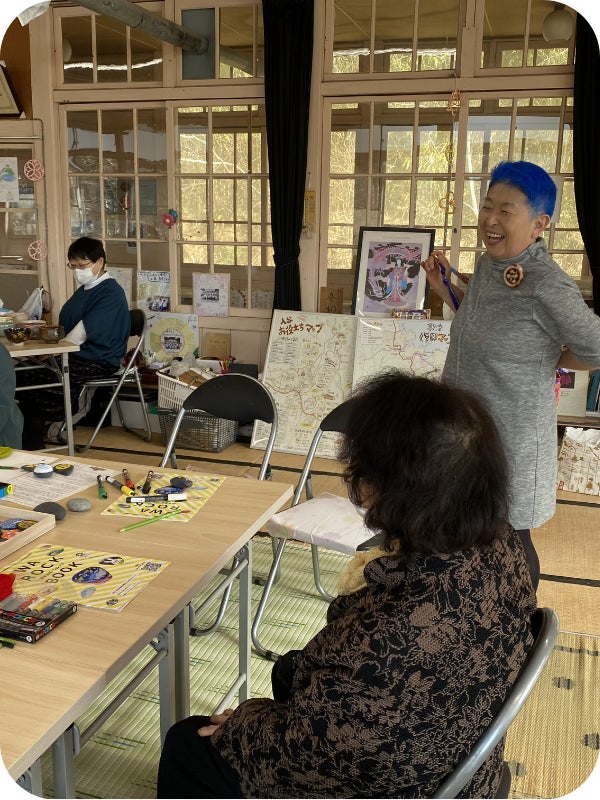 鮮やかな青い髪の美枝センセイが登場すると、「もう帰るからね」と言っていた参加者の方も思わず座り直し、会場の視線が集まります。