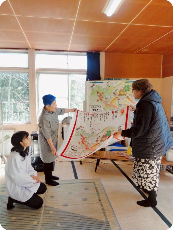 今回制作する防災ふろしきのサンプルを、皆さんに初めて見ていただきました。この日が“初披露”。真弓さんも感慨深い様子です。