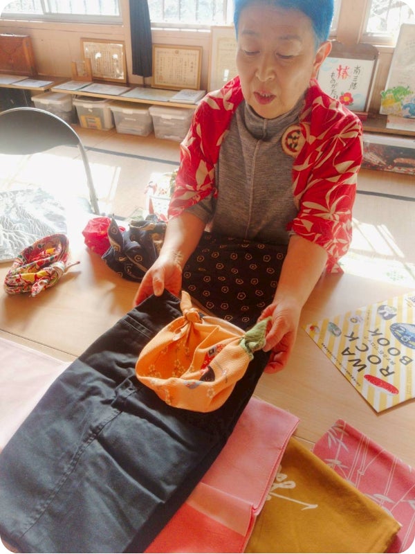 午後からは、「防災ふろしき交流会」を行いました。講師は、美枝センセイです。