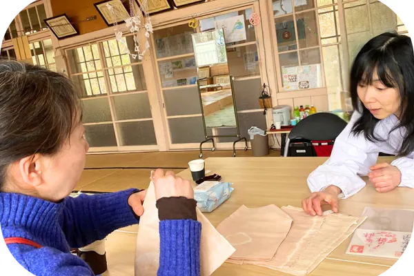 防災風呂敷も、椿染めの色を意識してつくられています。