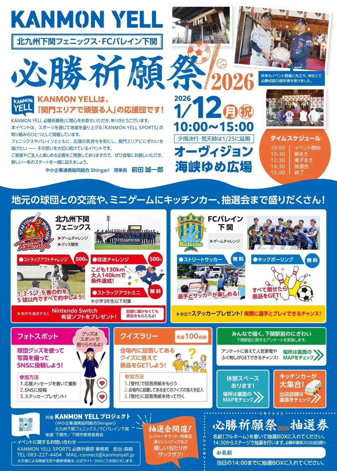 2026/01/11 17:00こんにちは!クラウドファンディング担当の者です!2026年1月12日に行われるKANMON YEEL 必勝祈願祭に北九州下関フェニックスが参加します!ストラックアウトチャレンジや球速チャレンジと楽しいイベントを準備しておりますのでたくさんのご来場お待ちしております!場所は下関市にあるオーヴィジョン海峡ゆめ広場です! もっと見る