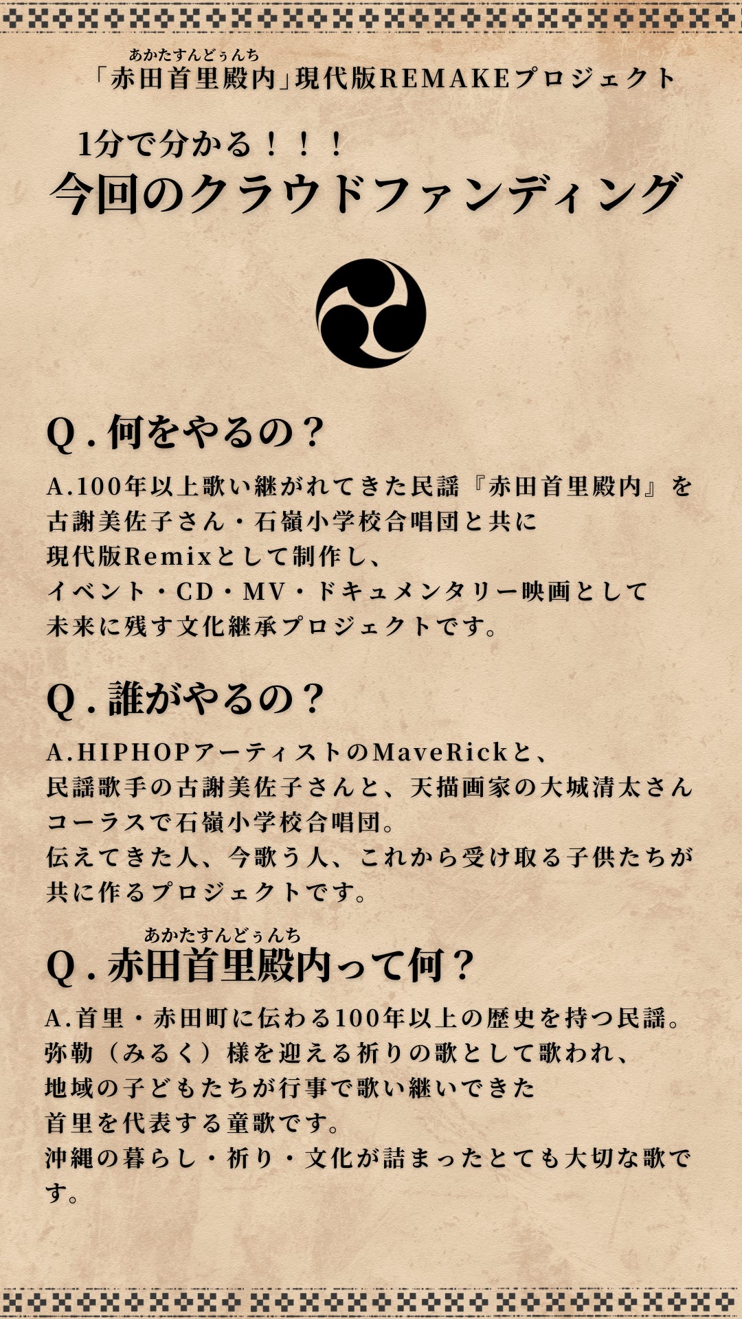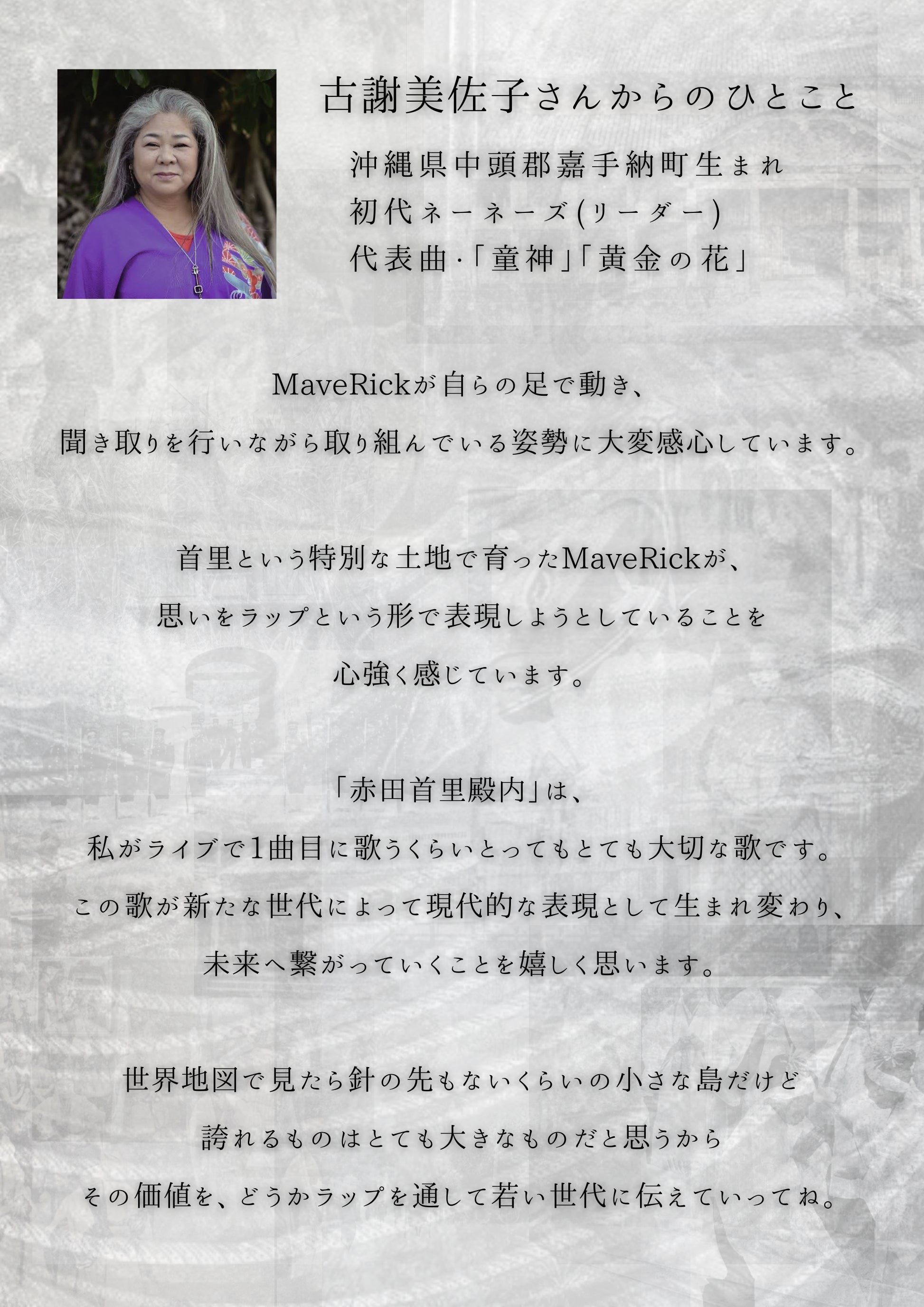 琉球に伝わる民謡「赤田首里殿内」を、古謝美佐子さん・石嶺小学校合唱団と共に“現代版”としてリメイクし未来へ繋ぐプロジェクトです。