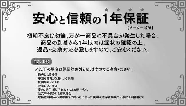 ※商品到着時の商品パッケージの汚れ、お客様自身による商品の破損に関しましては保証対象外となりますのでご了承ください。