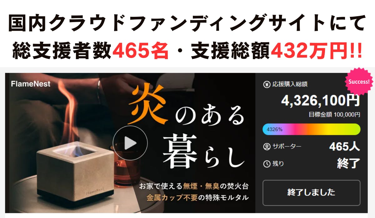 2026/02/22 19:00お世話になっております^^FlameNest プロジェクト担当です^^FlameNestは、“家で焚き火ができる焚き火台”です。でも、なぜわざわざ「家」なのでしょうか。キャンプの焚き火は特別。でも、毎日はできない。忙しい日常の中で、ほんの10分でも炎を見つめる時間があると、呼吸が少し整う。それが、家焚き火の意味だと考えています。プロジェクトはいま中盤。ここからは、“勢い”よりも“本当に欲しい人に届くかどうか”が大切な時間です。もし、少しでも心に残っているなら。ぜひもう一度、ページを覗いてみてください。また、現在のリターンは終了後すぐ発送可能な在庫を確保しております。できるだけ早くお届けできるよう、準備を進めています。引き続きよろしくお願いします^^youtubeはこちらhttps://www.youtube.com/watch?v=sVCgDcyyNg0 もっと見る