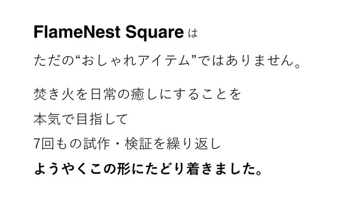 FlameNestは、そうした声に寄り添いながら、“誰でも、もっと自由に炎を楽しめる”新しい焚火の形を目指して生まれました。