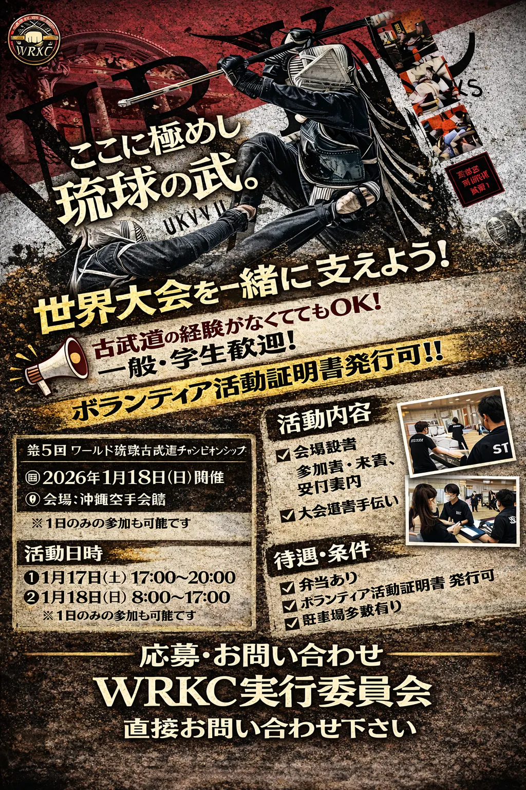 2026/01/06 14:492026年1月18日(日)沖縄空手会館第5回 ワールド琉球古武道チャンピオンシップ今大会は参加者増加のため、スタッフが不足しています!ぜひ皆さんの力を貸してください!一般、学生可!活動内容▶︎前日:1月17日(土)17:00〜20:00・会場設営 など▶当日:1月18日(日)8:00〜17:00・受付対応・選手・来賓案内・大会運営のお手伝い など●休憩、お弁当あり●学生ボランティア証明書 発行可能!・1日だけの参加可・2日間参加も大歓迎・空手・古武道の経験は不要・一般学生、武道に興味がある方も大歓迎!世界大会の裏側を体験できる、なかなかないチャンスです/興味のある方は、ご連絡ください! もっと見る