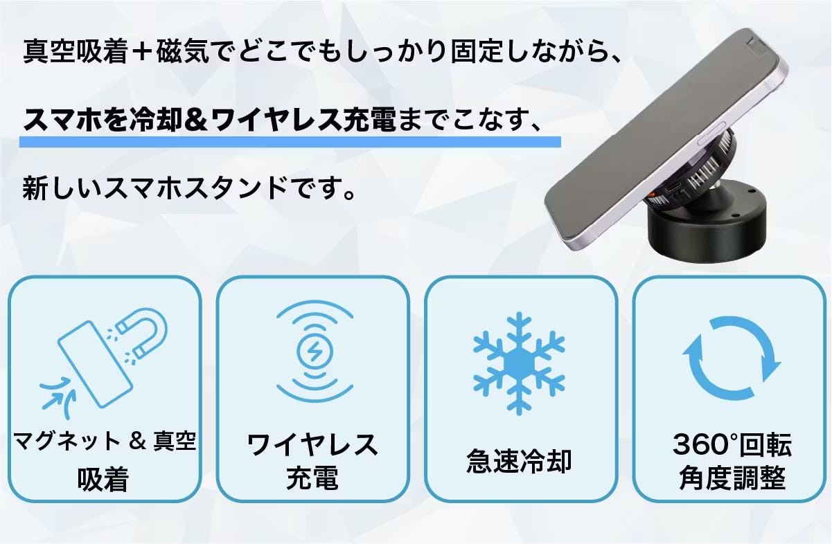 そんな悩みを解決するのが、革新的な次世代スマホスタンド「VACCUM COOL」 です。
