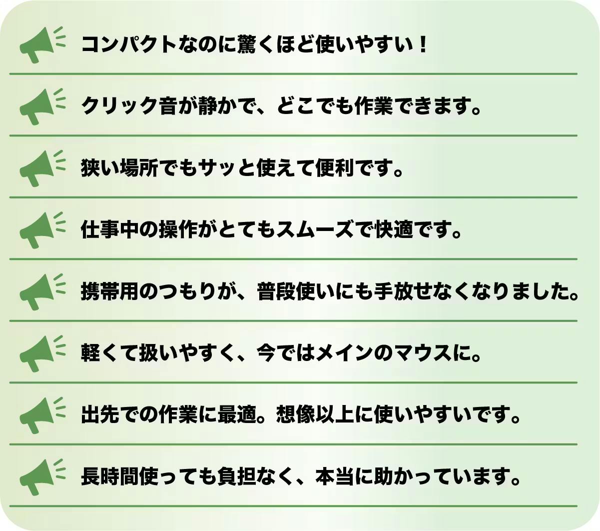 オフィスやカフェ、図書館など、静かな空間での PC 作業において意外と気になるのが、マウスのクリック音です。小さな音であっても、周囲に人がいる環境では無意識に気を遣い、作業への集中を妨げてしまうことがあります。Mini マウスは、そうした日常のストレスを軽減するため、静音性にこだわったボタン設計を採用しています。