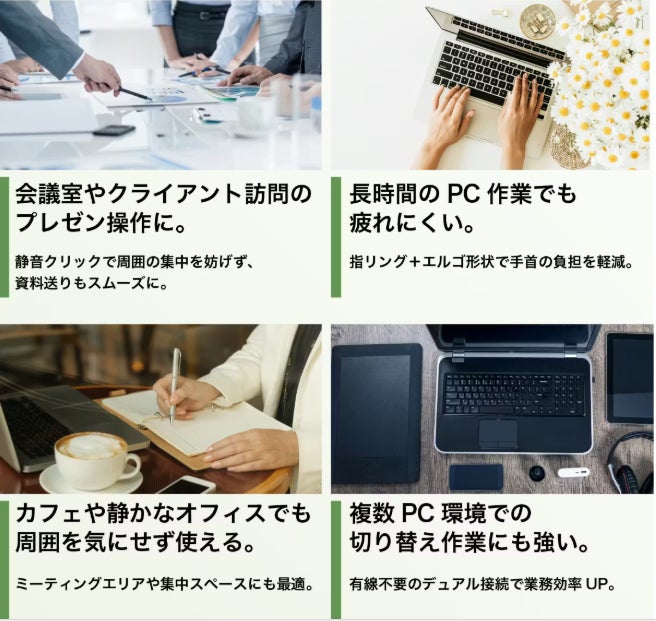 Mini マウスは、独自の形状によって手や指への負担を軽減する設計です。指先中心の操作により、手首に無理な力がかかりにくく、長時間の作業でも疲れを感じにくくなっています。資料作成や編集作業など、集中が必要な作業でも快適な操作感を維持。省スペース性と使いやすさを両立した Mini マウスは、日常の作業環境をより快適で自由なものへと導いてくれる存在です。