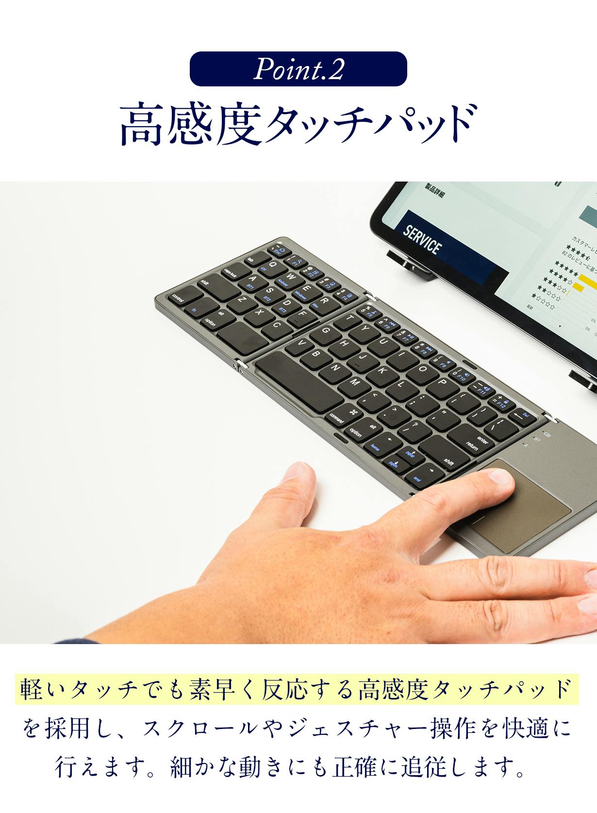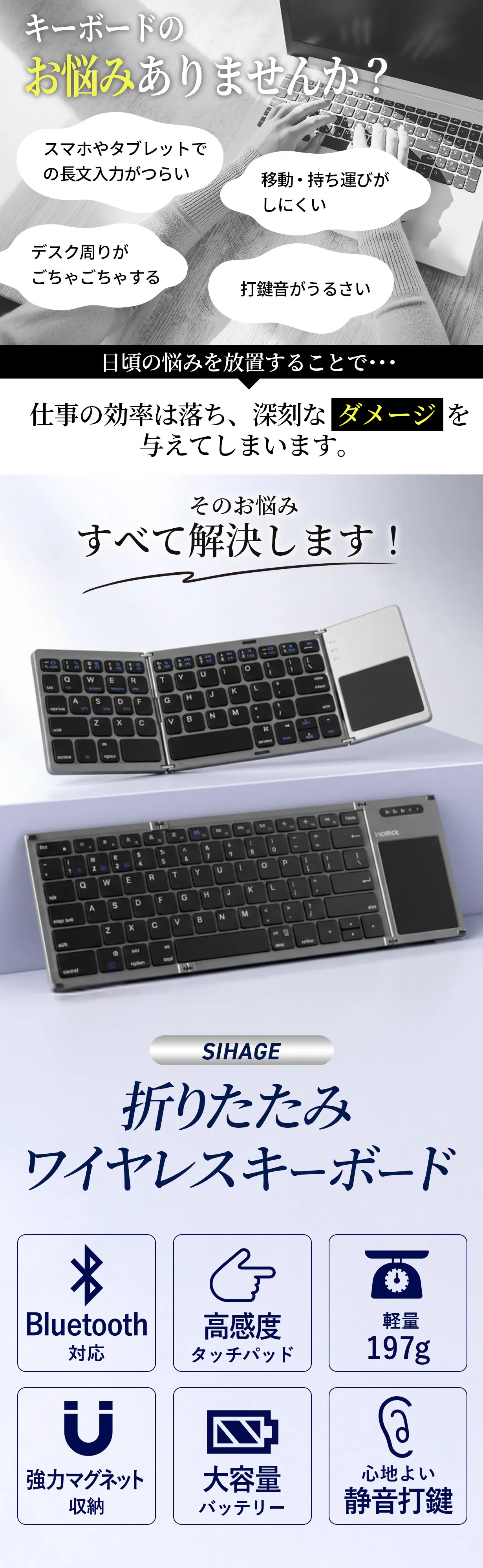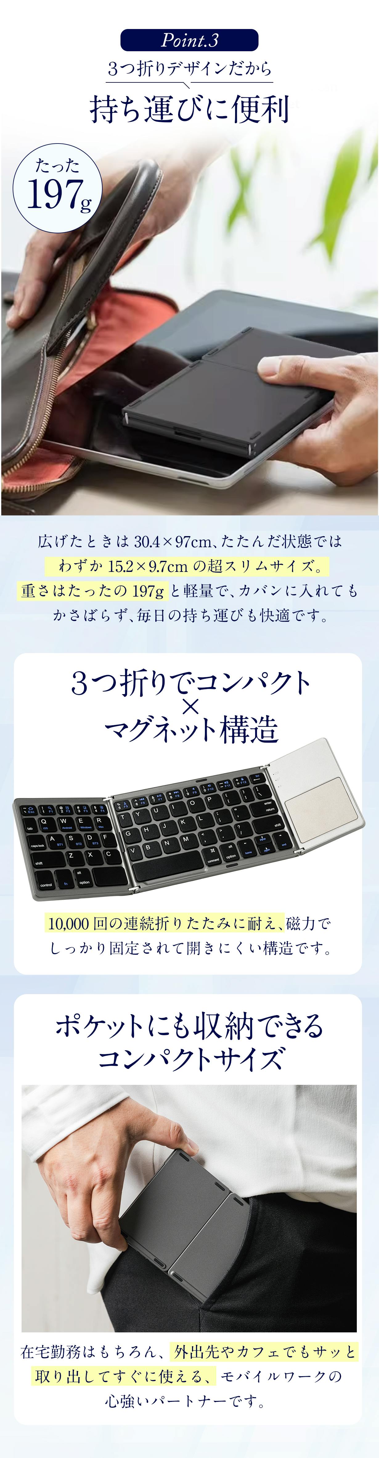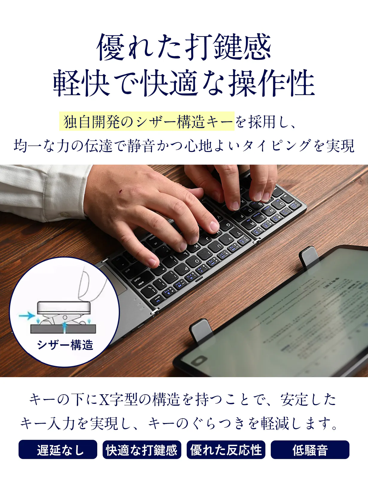 この折りたたみ式ワイヤレスキーボードは、わずか197gの超軽量ボディで、外出先でも気軽に持ち運べる設計です。マグネット収納対応の折りたたみ構造により、バッグの中でもスマートに収納でき、Bluetooth接続で複数デバイスの切り替えもスムーズに行えます。さらに静音設計により、カフェや移動中など、場所を選ばず快適なタイピング環境を実現します。