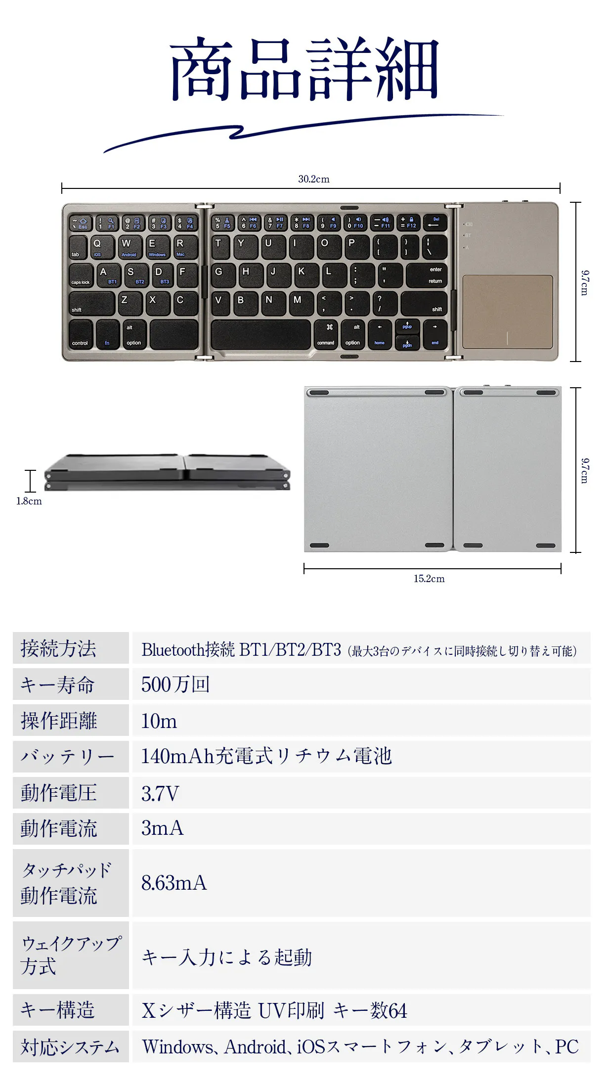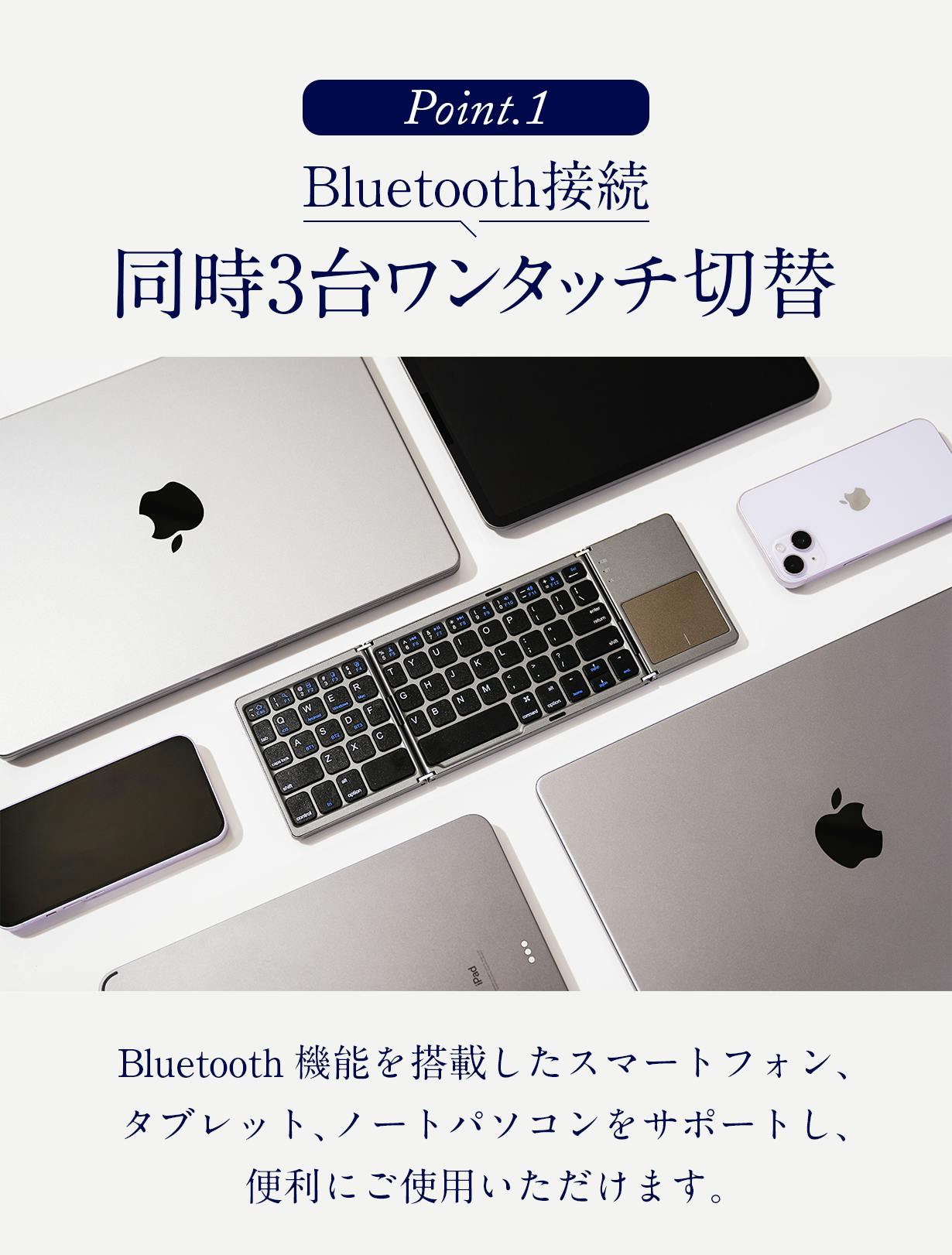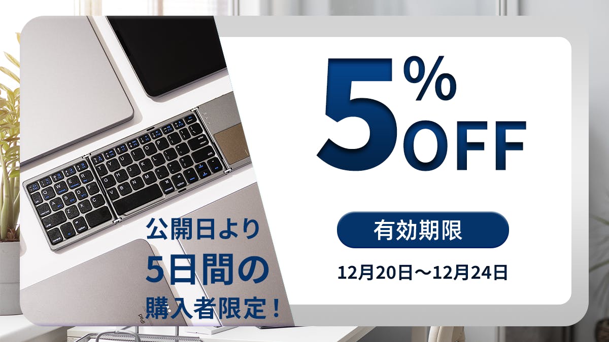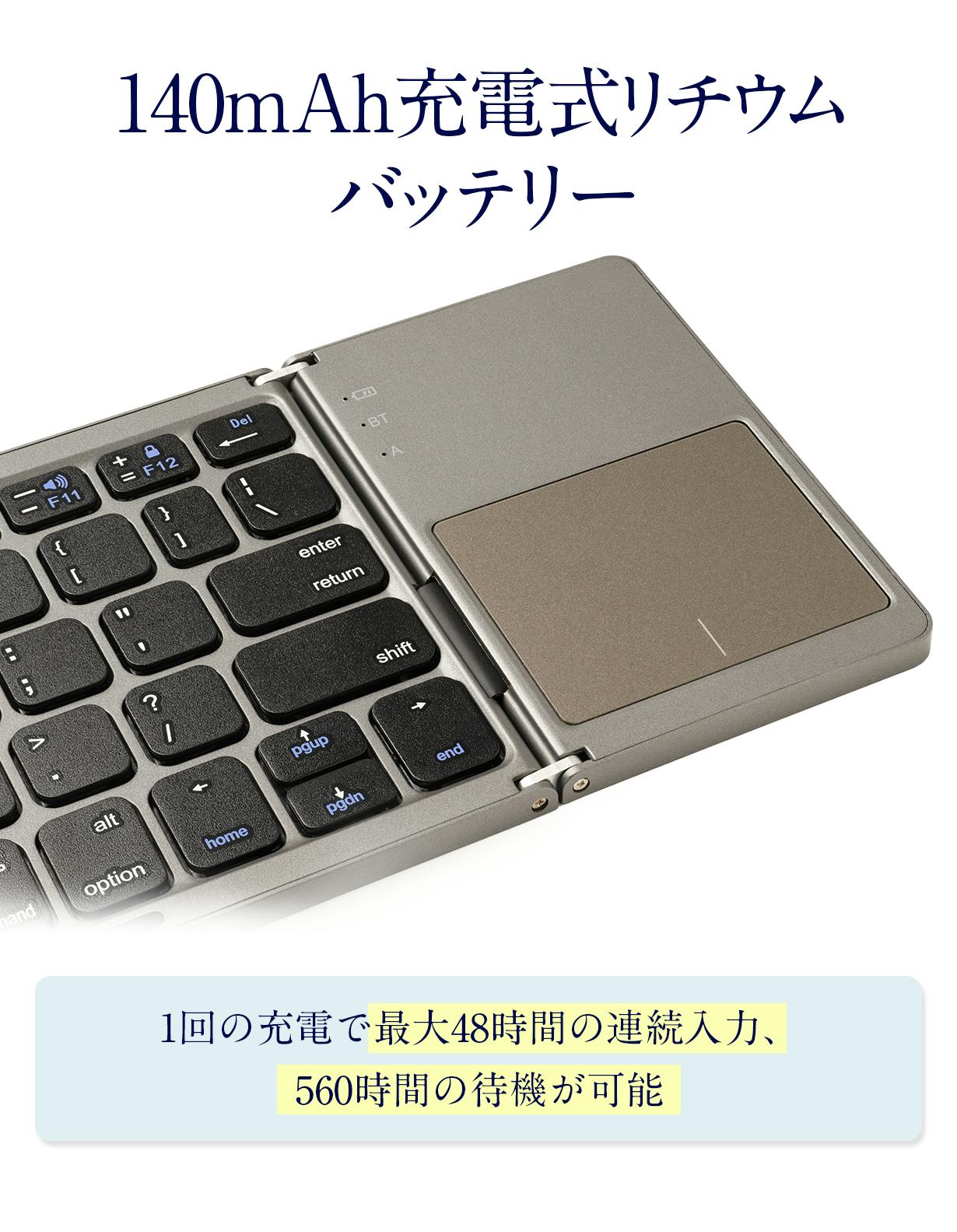 この折りたたみ式ワイヤレスキーボードは、わずか197gの超軽量ボディで、外出先でも気軽に持ち運べる設計です。マグネット収納対応の折りたたみ構造により、バッグの中でもスマートに収納でき、Bluetooth接続で複数デバイスの切り替えもスムーズに行えます。さらに静音設計により、カフェや移動中など、場所を選ばず快適なタイピング環境を実現します。