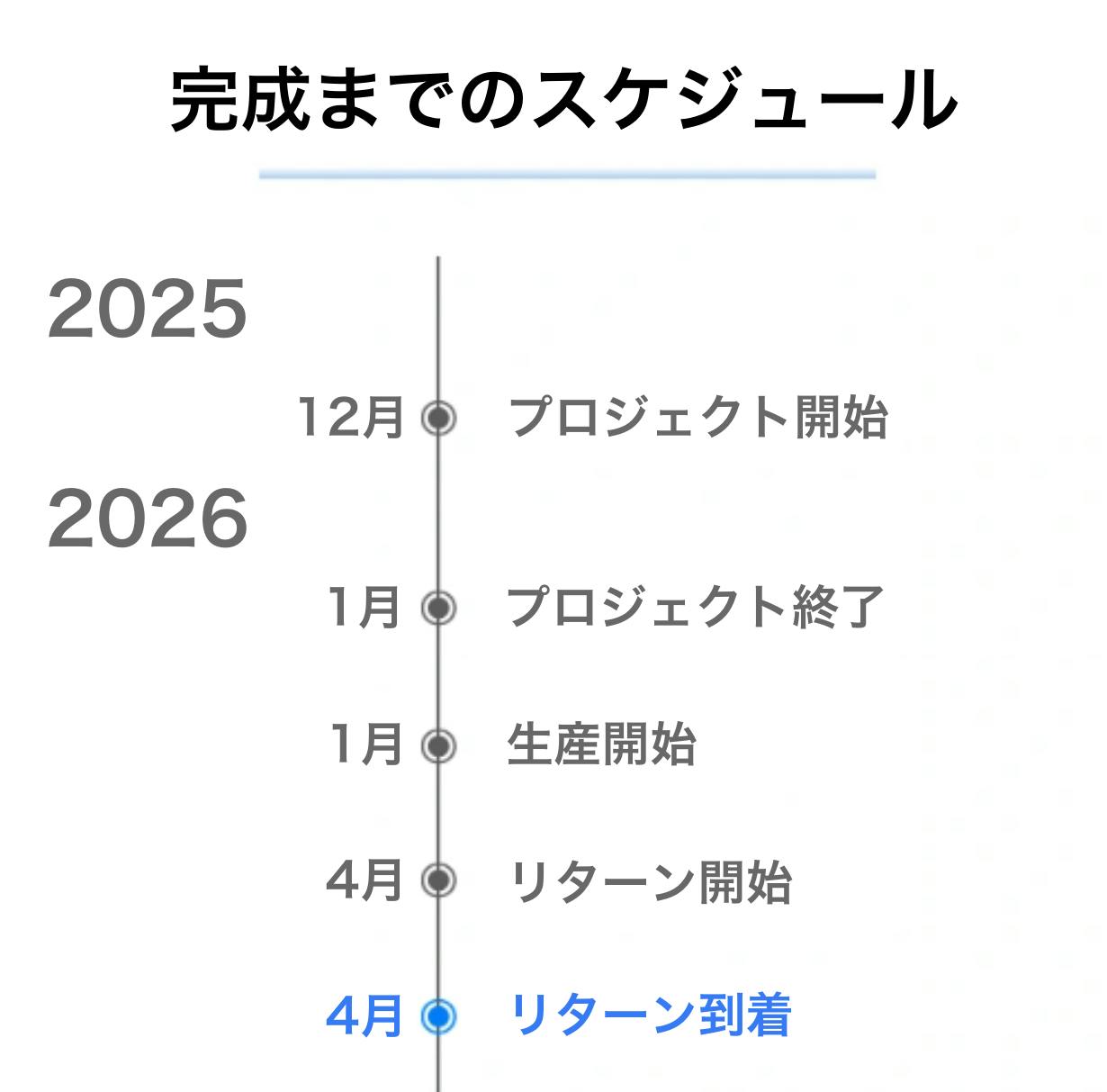 ※本文中に記載させていただいたスケジュールは、あくまでプロジェクト公開時点の予定です。クラウドファンディングを経て輸入を行う性質上、配送遅延のおそれがございます。